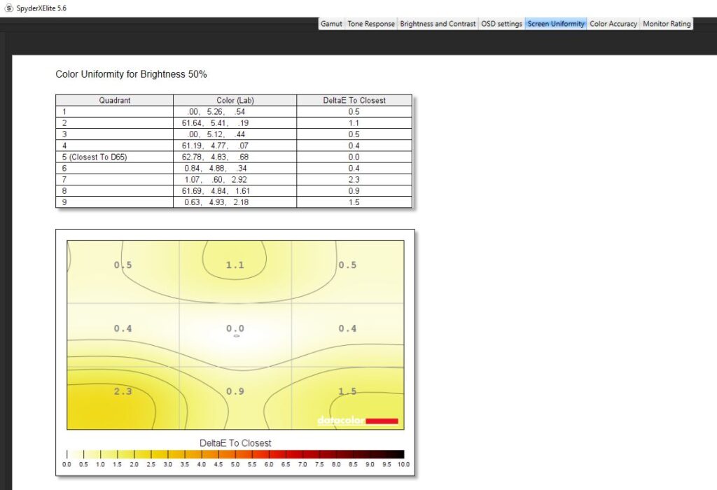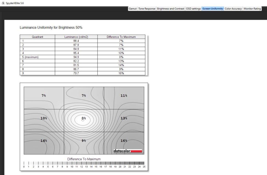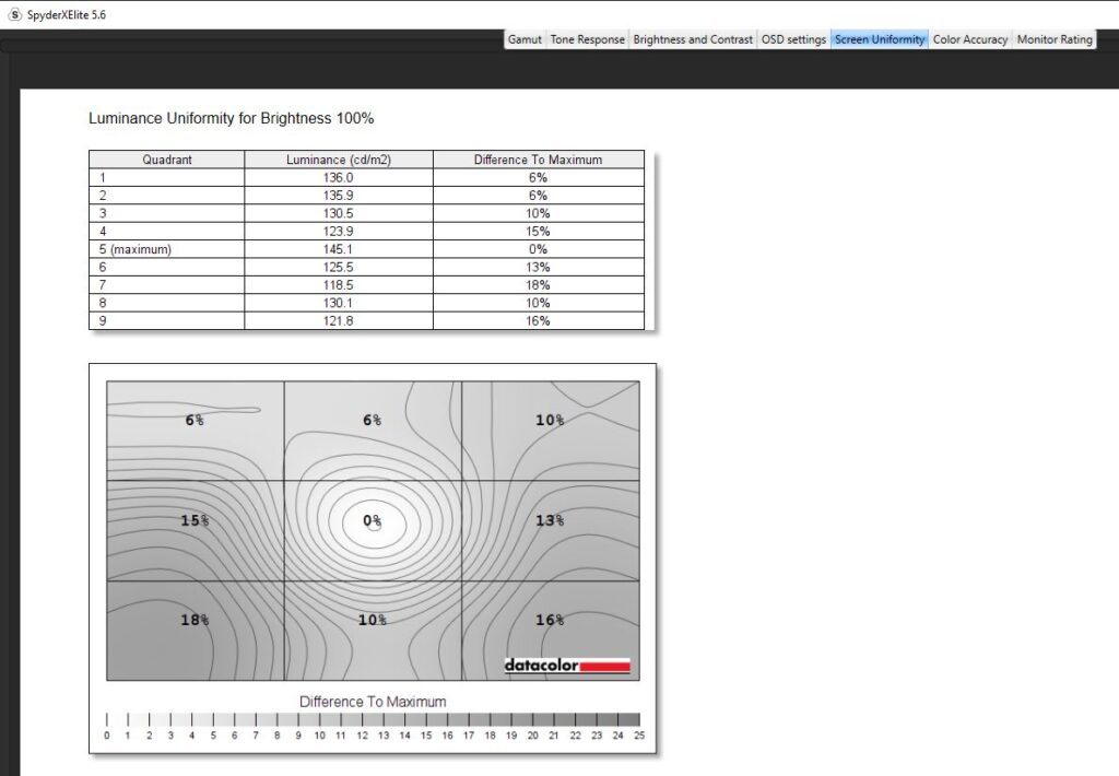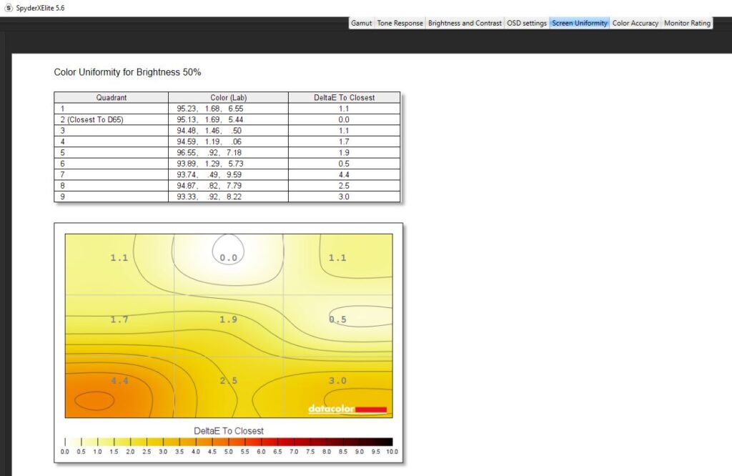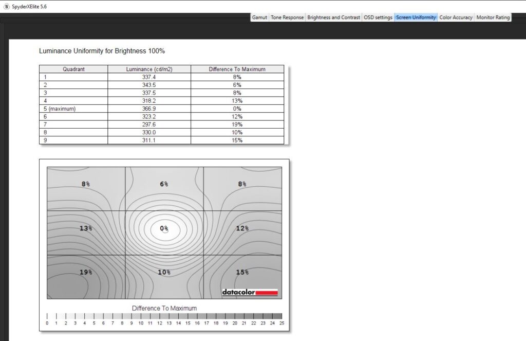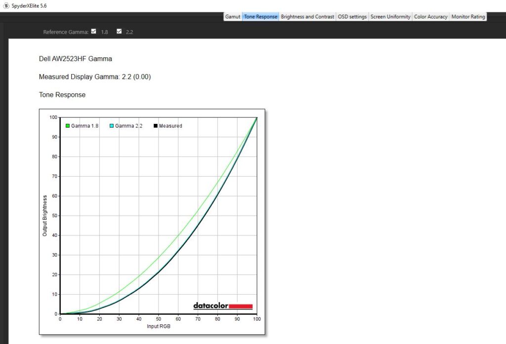 Diving into a calibration test, I ran it twice. Once before any kind of colour calibration had been done, and once after I had calibrated the colour. For the most part, the testing was nigh-on identical. Dell claims the Alienware AW2523HF has a contrast ratio of 1000:1, which is pretty on par with my findings. The contrast ratio was slightly different, with a 1110:1 pre-calibration and a 990:1 post-calibration which I wouldn’t say affected anything to do with gameplay and colour accuracy scored a slightly better Delta-E of 2.73 from 2.66 after calibration. Testing its colour uniformity, there was a hot zone in the bottom left and right-hand corners, which fell in line with what I was getting from the edge-lit LED backlight from the IPS glow present in the monitor. Of course, this is the worst-case scenario, and the image was taken in a very dark room. This had no effect on my gaming or even productivity when using the monitor and was non-existent when using it in my day-to-day life. On here as well you can see that Dell has used an anti-glare coating on the screen, which is probably causing that lack of max brightness but it’s there to stop reflections from being too distracting from lights in your room. Its luminance uniformity was actually very good, I was impressed with the score here and finally, while Dell claimed the monitor covered 99% of the sRGB colour gamut, testing for this pre-calibration though saw a score of 94% and after a calibration. The AdobeRGB score came in at 78%, 78% of the P3 gamut and 73% of the NTSC colour gamut. All in all, not a bad score, but there are definitely better monitors out there for colour accuracy. There’s 400-nits of peak brightness which isn’t too bad. Not enough for HDR gaming by any stretch, though this is an option you can turn on, but more than enough to get you through a game of Valorant. It was a little disappointing in this area, unfortunately, and I am someone who does prefer a much punchier monitor when it comes to brightness, even if it means losing out on some colour accuracy.