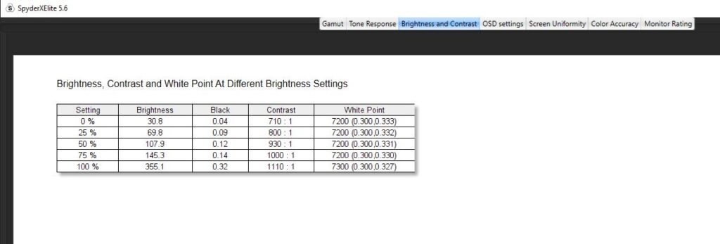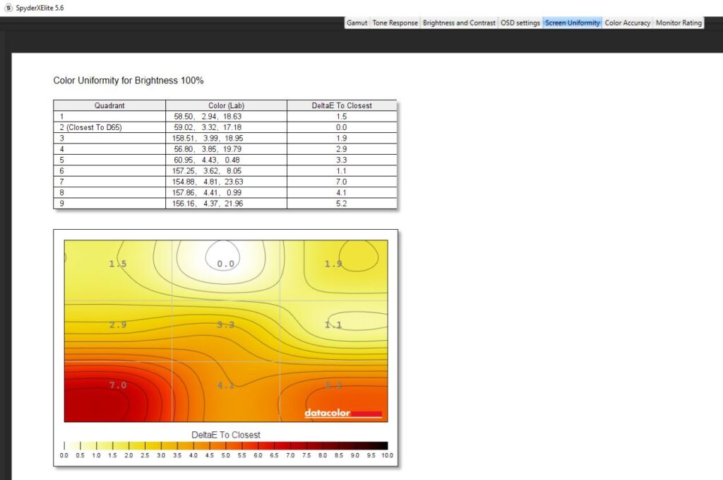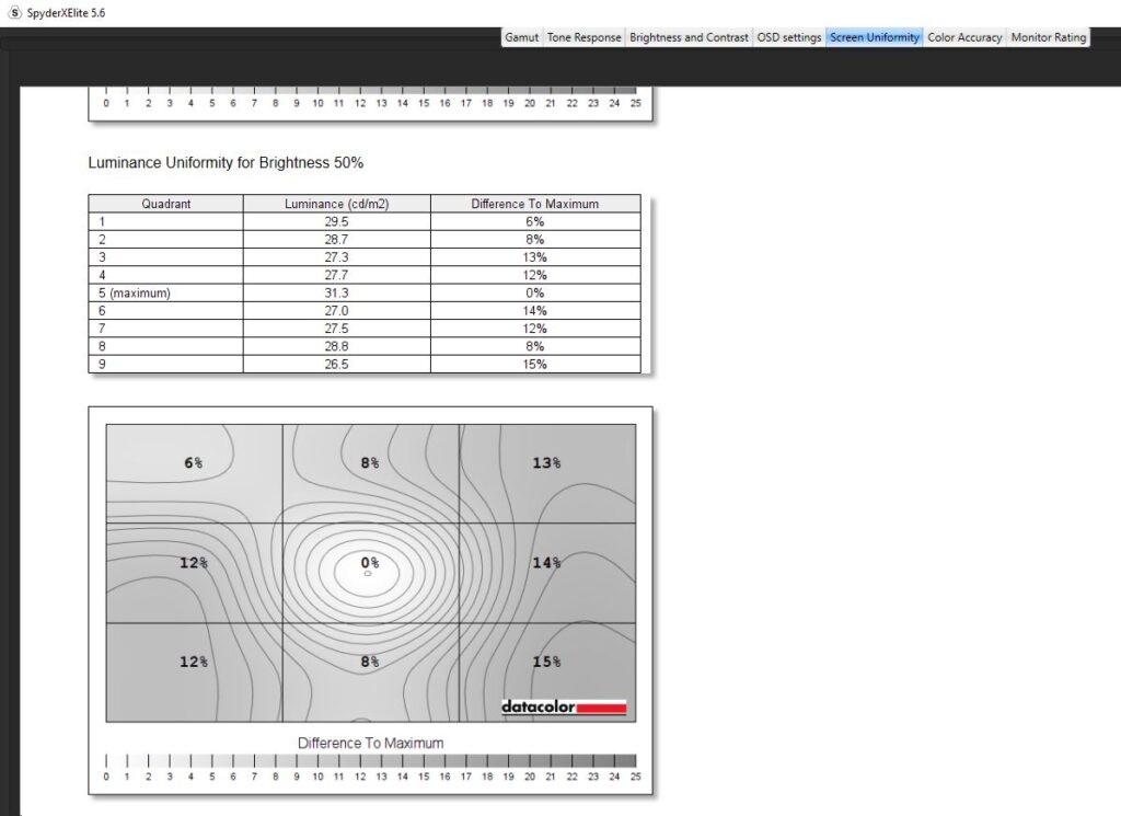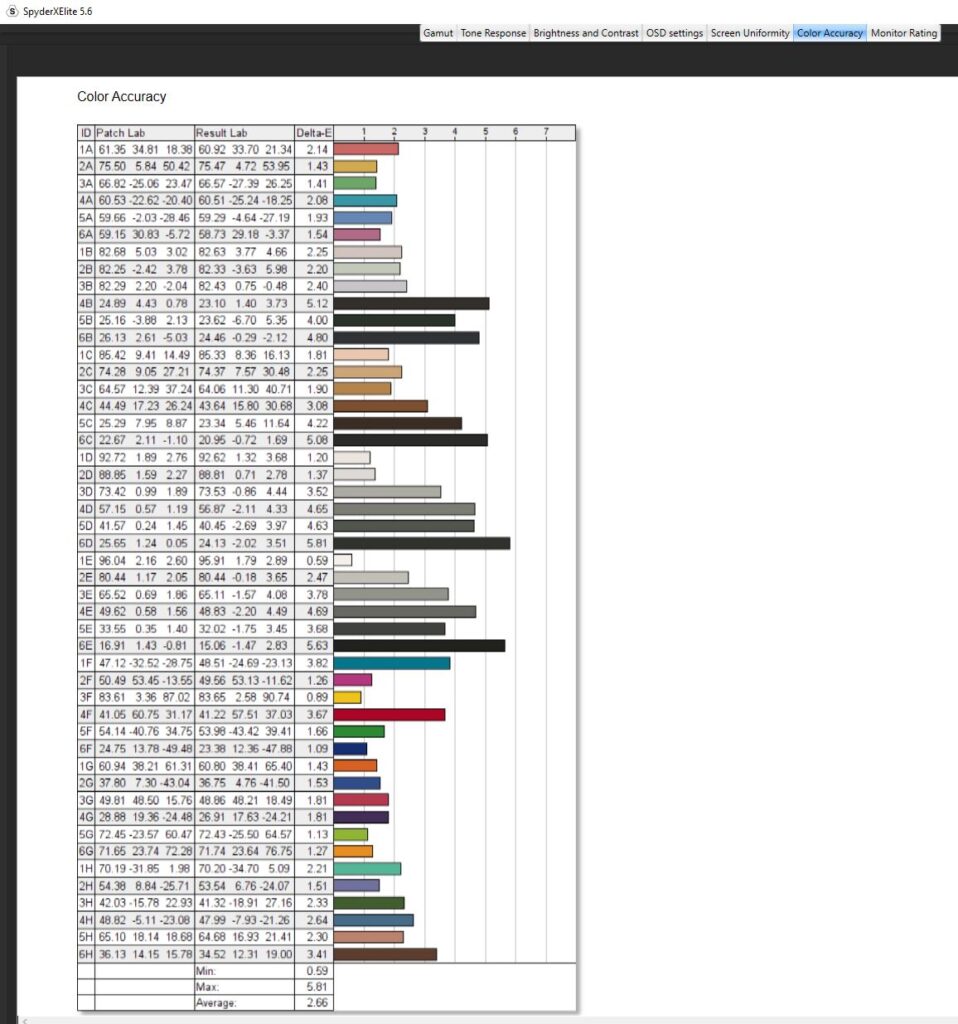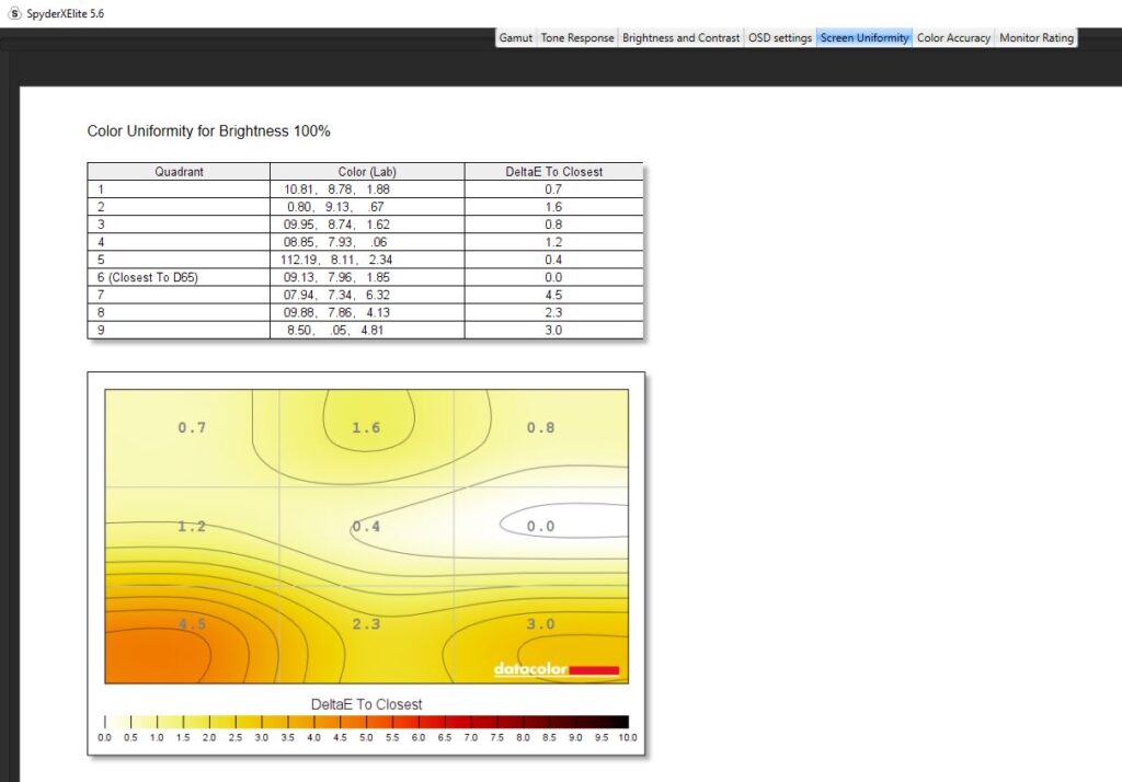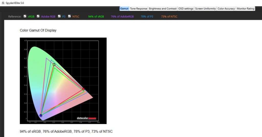 Diving into a calibration test, I ran it twice. Once before any kind of colour calibration had been done, and once after I had calibrated the colour. For the most part, the testing was nigh-on identical. Dell claims the Alienware AW2523HF has a contrast ratio of 1000:1, which is pretty on par with my findings. The contrast ratio was slightly different, with a 1110:1 pre-calibration and a 990:1 post-calibration which I wouldn’t say affected anything to do with gameplay and colour accuracy scored a slightly better Delta-E of 2.73 from 2.66 after calibration. Testing its colour uniformity, there was a hot zone in the bottom left and right-hand corners, which fell in line with what I was getting from the edge-lit LED backlight from the IPS glow present in the monitor. Of course, this is the worst-case scenario, and the image was taken in a very dark room. This had no effect on my gaming or even productivity when using the monitor and was non-existent when using it in my day-to-day life. On here as well you can see that Dell has used an anti-glare coating on the screen, which is probably causing that lack of max brightness but it’s there to stop reflections from being too distracting from lights in your room. Its luminance uniformity was actually very good, I was impressed with the score here and finally, while Dell claimed the monitor covered 99% of the sRGB colour gamut, testing for this pre-calibration though saw a score of 94% and after a calibration. The AdobeRGB score came in at 78%, 78% of the P3 gamut and 73% of the NTSC colour gamut. All in all, not a bad score, but there are definitely better monitors out there for colour accuracy. There’s 400-nits of peak brightness which isn’t too bad. Not enough for HDR gaming by any stretch, though this is an option you can turn on, but more than enough to get you through a game of Valorant. It was a little disappointing in this area, unfortunately, and I am someone who does prefer a much punchier monitor when it comes to brightness, even if it means losing out on some colour accuracy.