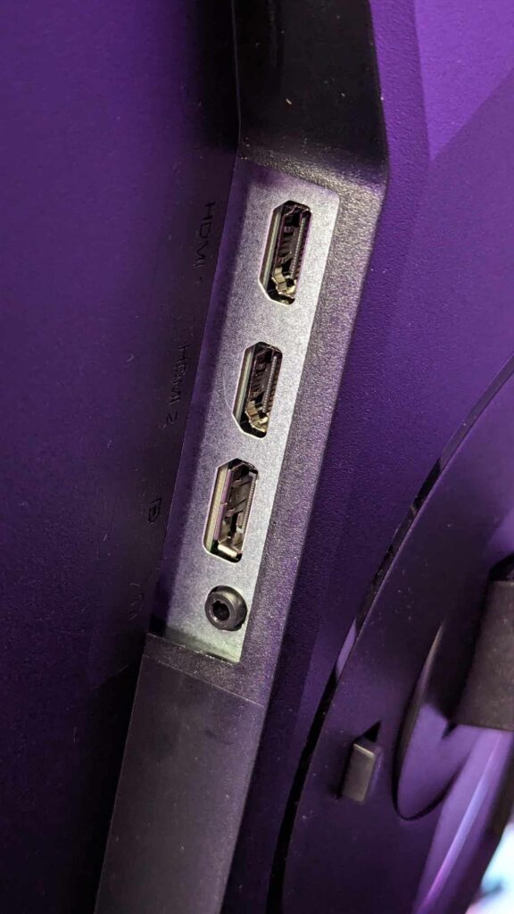 The monitor arm is chunky and features an off-centre cable management hole which looks a bit strange. Why the squared-off monitor arm isn’t centred is a bit of an odd design choice by AOC, because it’s not like the cable management hole goes from front to back. It kind of goes from side to side, which doesn’t really hide any cables. The arm though is capable of height adjustment, tilt, swivel and rotate if you’re after a vertical aspect ratio on your monitor which makes it a flexible choice for those with a multi-monitor setup. Around the back, you’ve got two HDMI 2.0 ports with HDCP 2.2. There’s one DisplayPort 1.4 which I used for my testing with a 4070Ti and finally, you’ve got an aux input for audio. It’s a very simple setup here. There’s no USB hub which I can honestly take of leave at this point. I don’t ever use them. And because it’s got that HDMI 2.0 input, you’ll be safe to use this with a games console too and get your 120Hz refresh rates at 1920×1080.