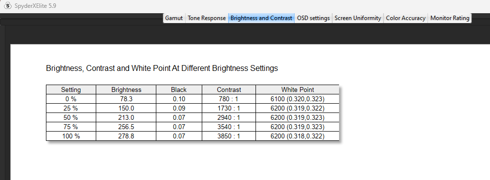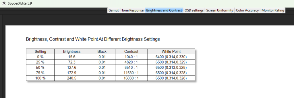 Running a test for brightness and contrast on an SDR setting, at 100% it gave me a result of 240.5 nits of brightness with a contrast ratio of 16,030:1 which is nice when playing in darker environments with little lighting inside of games. When I tested it again with HDR switched on inside of Windows, and with the DisplayHDR setting switched on physically on the monitor too, and at 100% the monitor achieved 278.8 nits of brightness with a contrast ratio of 3,850:1 which was a lot higher than in the SDR mode, but unfortunately, nowhere near the advertised DisplayHDR 400. But because of the nice inky blacks and decent contrast ratio, I don’t feel as if you’re missing out by not using HDR as the difference between brighter and darker areas in certain scenes are astounding anyway. In both instances, my white point at between 6,200 and 6,500 which was really good to see and did not skew much at all with the HDR mode switched on either.