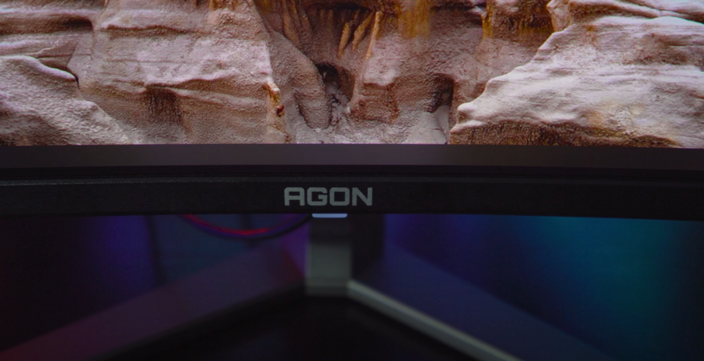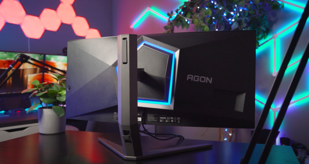 The stand as I said is chunky, and also quite heavy and offers little cable management support, but can tilt, swivel and pan, but there’s no rotation here which I think is fine. I don’t think many people will want to use this screen vertically anyway. Around back again you’ve got some quite nice large AGON branding, and some subtle RGB effects. You’re not going to get much in terms of glow from this unfortunately, but it’s a nice to have I suppose. You’ve got two HDMI 2.0 ports, one single DisplayPort 1.4, a USB hub featuring one powered USB Type-A and two data USB Type-A inputs with a USB 3.2 Gen 1 hub speed. There’s a joystick on the back right hand side to navigate the OSD, and there’s not really much in terms of menus to get lost in.