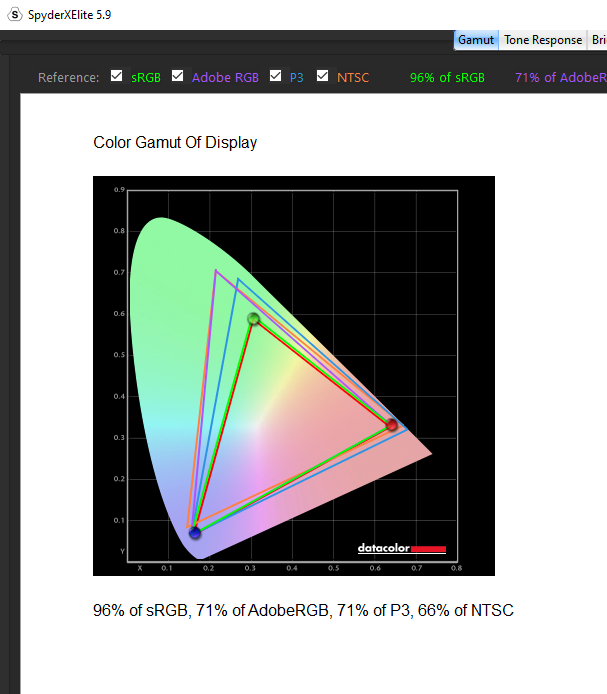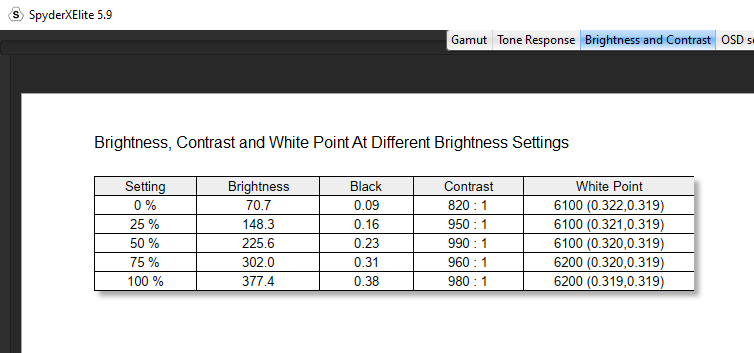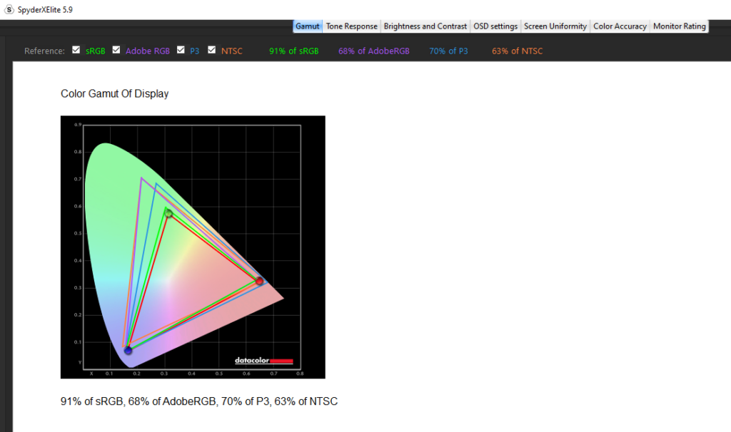 Running through my first tests before the monitor was colour calibrated, and with a brightness setting of 70, which the sRGB mode gave me, I saw my colour gamut come back at at 91% sRGB, 66% AdobeRGB. 70% P3 and finally 63% NTSC colour gamuts, which I must say isn’t really too bad. However, after a colour calibration using my Datacolor Spyder Elite, I found that my sRGB was raised to 96% while my AdobeRGB was now at 71%, my P3 at 71% and finally my NTSC at 66%. So I saw a small increase there. Moving on to brightness a contrast, Datacolor gave me a reading of 980:1 contrast ratio at 100% brightness, and a 990:1 at 50% brightness. The white point did unfortunately suffer coming in at 6200 at 100% brightness and lower than that at lower brightness levels.