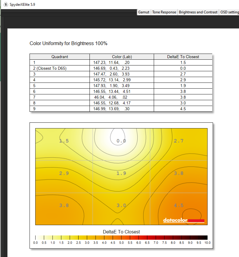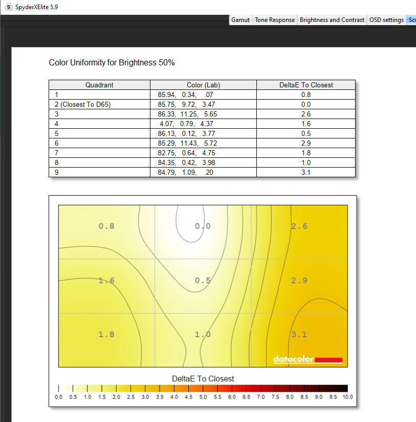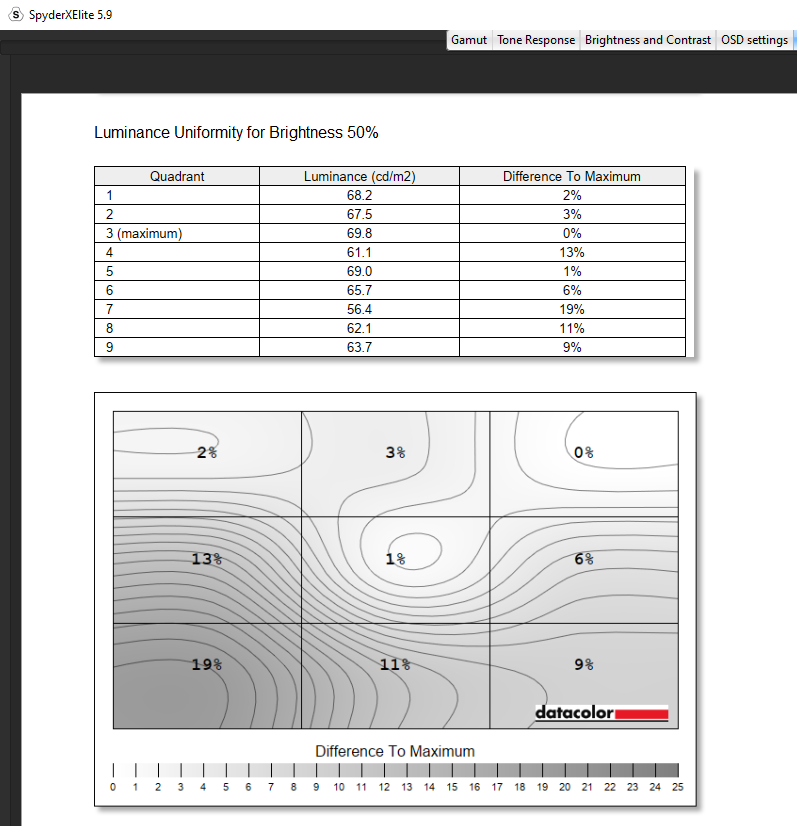 Colour uniformity at 100% brightness didn’t perform too badly, but I did see a hotspot in the top middle and a darker spot towards the bottom corners. Overall though not too bad. And when I went down to 50% brightness things improved somewhat but we still saw the top middle perform the worst. Luminance uniformity again fell down and at 100% brightness, the biggest difference was down the left-hand side, but at 50% brightness things got way worse on that left.