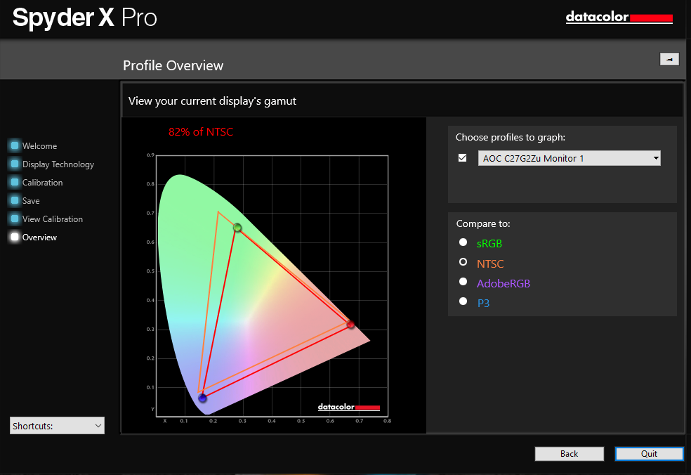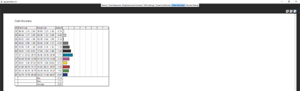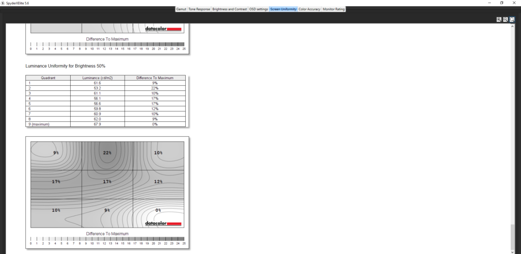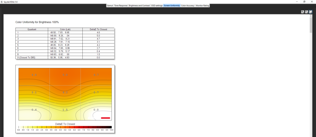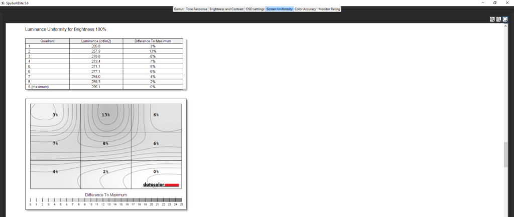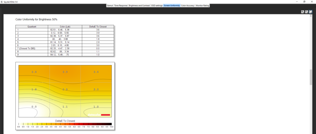 Speaking of colour, during our testing we found that the AOC C27G2ZU hit 100% of the sRGVBB colour gamut which is definitely advantageous for gamers and casual users as this is what you’re going to be generally using for your time with the monitor. However, for any designers out there or people who are needing a monitor for colour work, it’s not the best option. It measured at 85% of the AdobeRGB colour space, 82% of the NTSC colour space and 91% of the DCI-P3 colour spectrums. All decent scores, I don’t want to take that away, but it’s still not as accurate as some professiional grade monitors. The same with its Dela-E score. With an average of 0.92 in our testing, colours can be said to be pretty accurate, with an unfortunate downfall in the blue/teal colours which is where the average score loses out. Display uniformity is also pretty decent too, which is usually a big downfall in monitors on the cheaper end of the scale, but lose out in the corners where you can see there is backlight bleed, which means you could start seeing washed out colours.