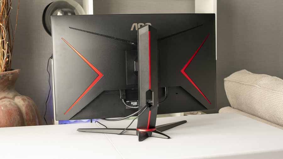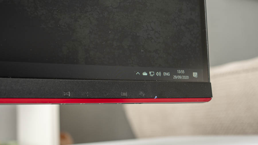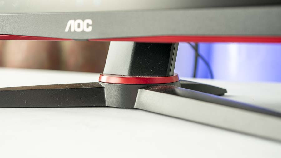But all of this is wrapped up into what I can only describe as a gamer-targeted design. The monitor is black, but there’s flashes of red dotted around the product, most noticably on the stand and around the legs, but there is that staple red streak across the bottom of the front frame. While we’re here, I want to point out the bezels. They’re pretty skinny. The rear of the monitor has a couple of red streaks on there, but you’re never going to see it when your monitor is on your desk.