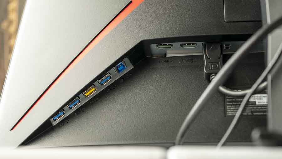 There’s also a decent amount of ports on the back too. You can find a DisplayPort 1.4 as well as two HDMI 2.0s. There’s a port for your headphones to bypass the built-in 2W speakers which quite frankly are pretty naff anyway, and also a small four port USB hub with USB 3.2 Gen 1 speeds. All cables are included to get you going as well, so there’s not too much need to go out and buy extra cables, unless of course you need them longer than 1.8m.