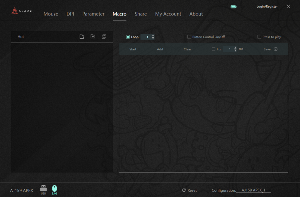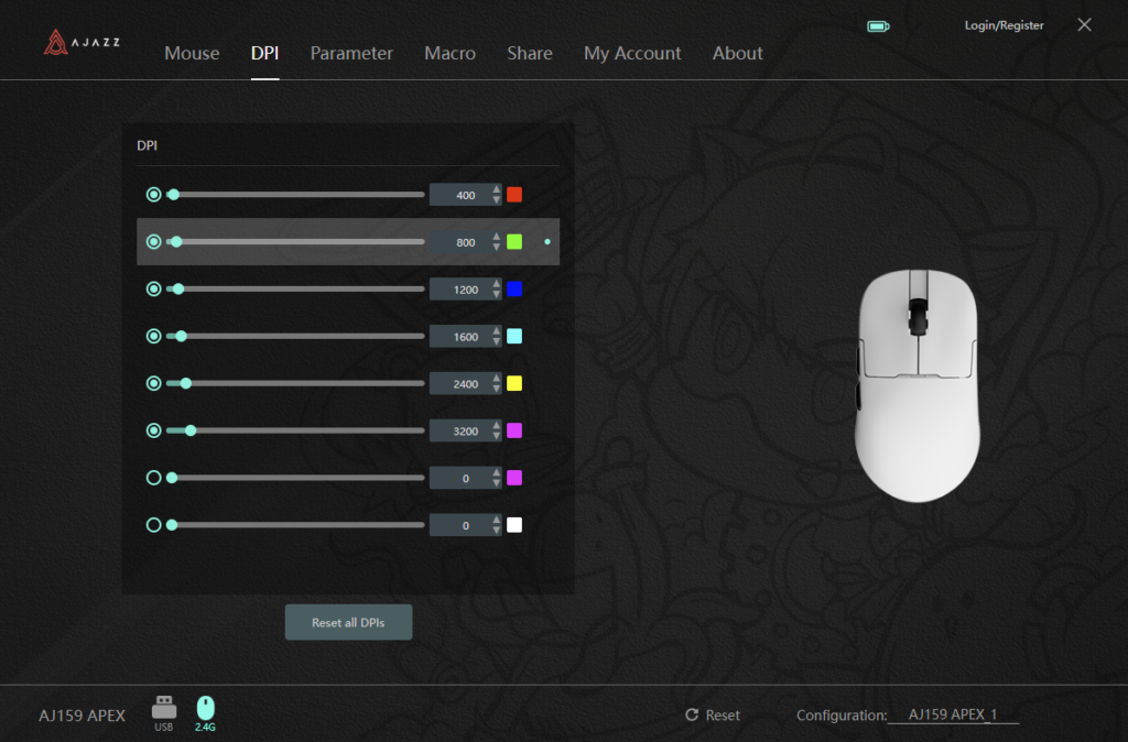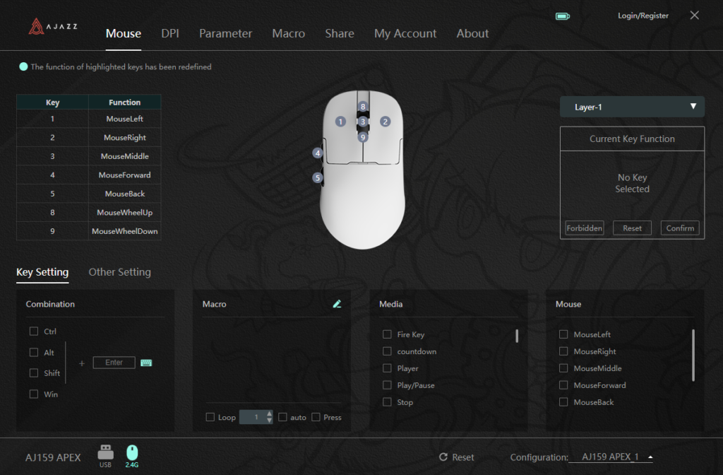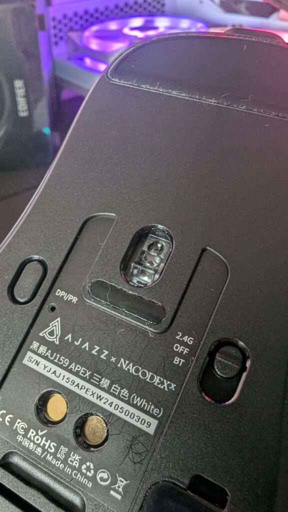 On the bottom you can find a PixArt PAW 3950APEX and however, doing a bit of research, it seems like a bit of a proprietary sensor, hense the Apex name. Advantages here can be a DPI level of 42,000, a polling rate of 8,000 which is set within the driver, and also power draw, of course being less than older sensors, which in turn extends battery life of wireless mice. The 3950 being a successor to the popular 3395, it has the ability to use Motion Sync at a higher polling rate, hence the 8000Hz polling rate the AJ159 can hit which helps immensely with dropped polls, which is the syncing of your USB polling rate with the sensor readings from the mouse. It makes the mouse more accurate, but really how much more accurate over the X3 that I’ve been using for a while now? I don’t know. But then I’m a casual gamer and not gunning for those pixel-peeping headshots so… take it all as you will.