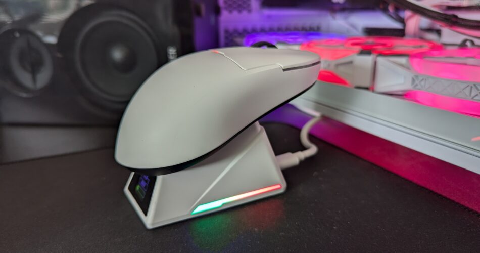 Even though it’s lightweight, the body still feels a nice build quality. For buttons you’ve got a left and right click, a scroll wheel and two thumb buttons. There’s a DPI switcher on the base, but why it’s there is beyond me. I do like flicking between a higher and lesser sensitivity when I’m playing FPS games, and it being on the bottom is too much of a burden to be able to change it on the fly. The mouse uses Huano switches which feel nice and clicky and tactile and they’re rated for up to a million hits. There’s a nice return rate too on the mouse so it feels like the clicks really follow your finger, and it doesn’t feel like you need much effort to press either. It connects to the dock via 2.4GHz but you do have Bluetooth or the option to use the included USB Type C cable too if that’s more your thing. I didn’t notice any kind of latency lag when using it wirelessly inside of games, but unfortunately I don’t have any real scientific way to test this except how I feel about it.