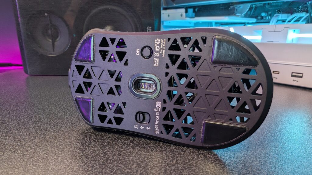 You’v got tri-band connectivity here thanks to the Nordic52840 chip for Bluetooth 5.1, a 2.4GHz connection and even a wired mode if that’s more your thing, though if you are using this mouse wired, you do lose out on polling options, and it’ll only go up to a 1,000Hz polling rate though to be honest that’s not bad at all if you’re anything like me playing games casually with your friends of an evening. If you’re on stage playing eSports titles, then maybe not. But I doubt anyone like that is watching my videos anyway, or that they even buy their own equipment, as sponsors will probably sort them out.