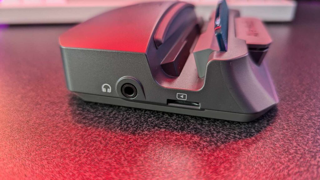 Let’s look at the physical dock for now because for one I am impressed with how it looks. It’s quite smart looking, and coming in the space grey colour, it definitely fits in with my setup here. Having the blue light across the front is tasteful yet modern, and it does flash red so you know it’s recording. It is very plasticy which does give off a cheaper feel, and the recording button on the front is pretty responsive for me. My Steam Deck sits in there very nicely and I’m not worried about it falling or tipping. It has got a plastic front to hold it but a rubber rear to protect it from any kind of scratches.