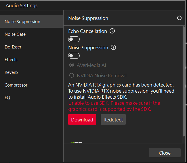 As it stands from plugging it in straight away and then connecting it to OBS Studio to record some gameplay, it sounded good. Check this out. But that isn’t the only way this microphone can be used. If you’re plugging into a PC, you can use AVerMedia’s Streaming Centre to aid with audio quality. Once added to the Streaming Centre you’ve got loads of options to run through from noise suppression, a noise gate, a de-esser, a compressor, an EQ reverb and various effects. There’s loads to really dive into. Just to let you know to use the noise suppression option, you’ll need an Nvidia RTX-compatible card for the Audio Effects SDK.