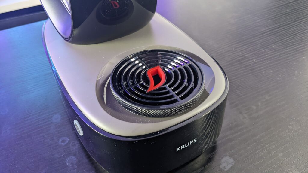 On top, you can find the main controls. Well, all except the power button that’s located on the side of the base. On top is a touch-sensitive slider that you can set to determine the amount of water needed, and this is measured by a scale found on the boxes of your capsules, or capsules themselves. Above that is a toggle, which you can flick left for cold water, and right for hot water. Dolce Gusto is calling this a ‘manual’ machine. But it feels pretty automatic to me, as the water cuts out when the LED lights hit zero as it fades down depending on how much water has been dispensed. It beats my older Piccalo model as I had to guess how much water each capsule needed. Here you’ll also find the tray where your coffee pods go. Once inside, the machine will pierce the film so water can travel through the pods to dispense your coffee. Once finished, just pull the tray out and discard the pod. Make sure you remove the coffee from the pods though as these can be recycled.