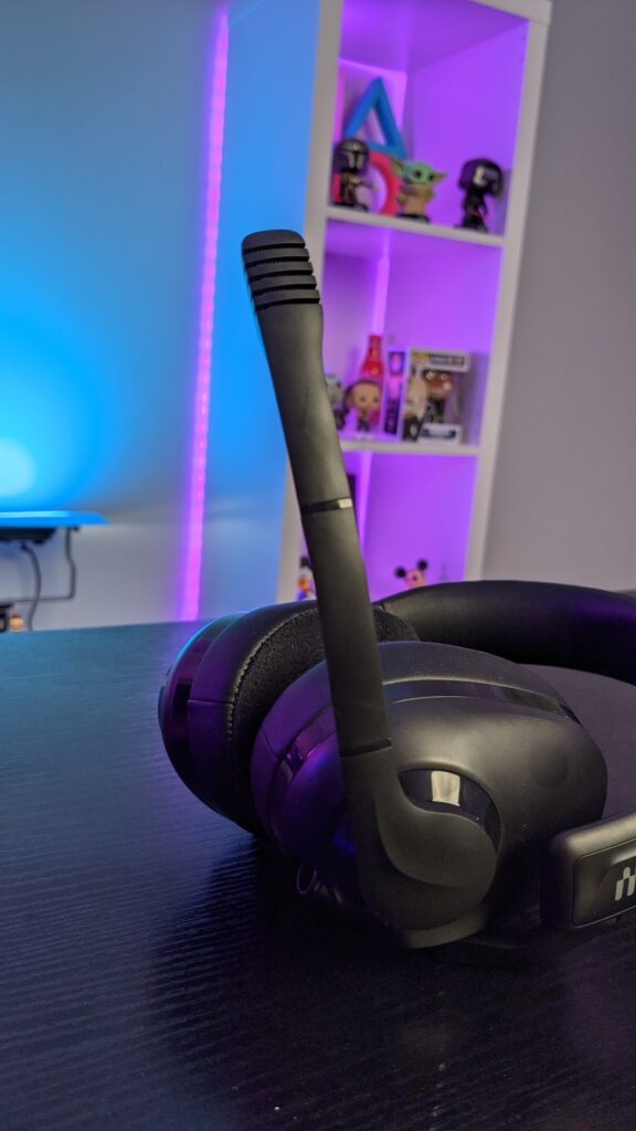 The UI on the side of the right earcup is incredibly simple. It’s literally a volume wheel which is great by design. There are no buttons you have to scramble around finding during heated moments inside of games. It’s smooth to turn and pretty accurate, and there’s no fear of accidentally nudging it either. On the right is a detachable 3.5mm aux cable which is braided by the way to not snag on the back of a desk, and also the microphone which is on a boom arm which does bend if you need to move it closer to your mouth.