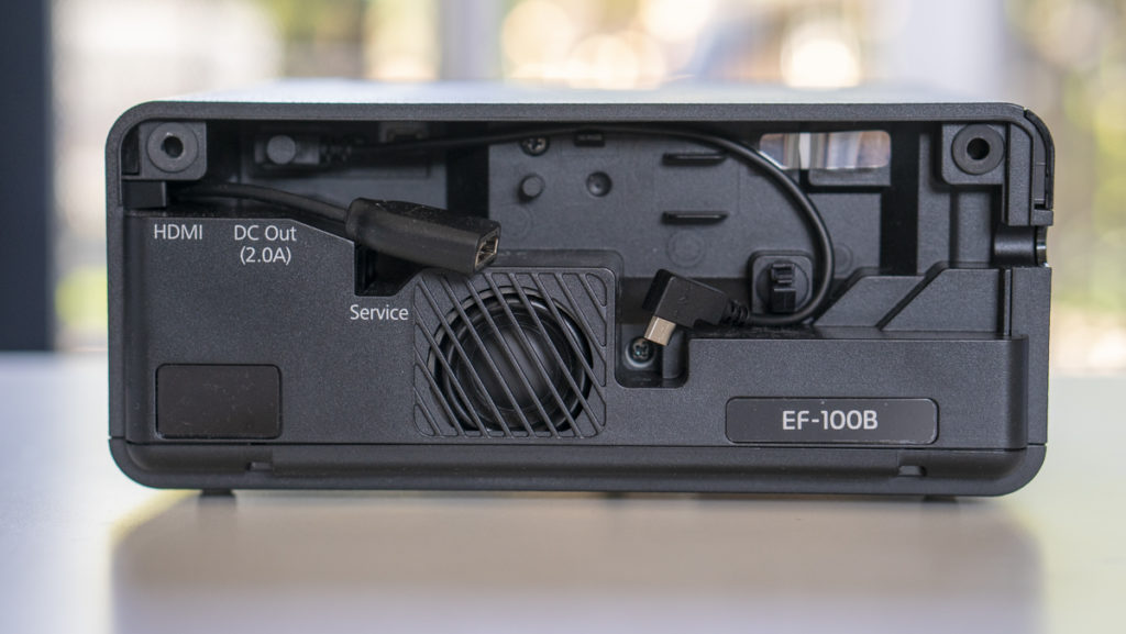 The Epson EF-100B portable projector comes in a very small package, measuring only 21cm wide, 9cm tall and 23cm in depth. It has a small opening on top right of the front for the lens and you can find all the buttons you will need on top including the focusing ring. The front is bordered in bronze plastic, giving it a nice premium finish, and the front panel acts like a grill for airflow. You will find several other grills and fans down the side of the device.