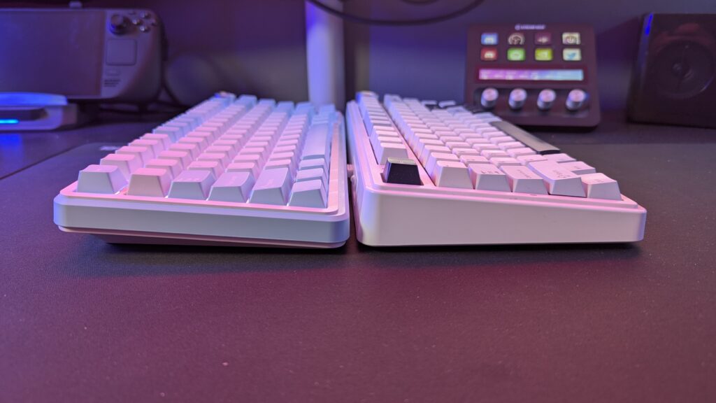 Between the two taking a look at first glance, you can tell there’s a difference in shape with the GS75 being a lot more rounded in the corners, with a colour-themed rim. My GS75 here is in a baby blue-themed colourway which I don’t think is their best design, as the font is quite hard to see on the keys though there are five different colours to choose from and depending on eye-sight, your mileage with this blue and white variant may vary. Anyway, this colourway compared to my F75 here, I know which one I’m choosing, and that’s purely down to being able to see the keys on the F75, but I must say the GS75 does look more modern because of it. The housing though on the GS75 looks a lot chunkier can I say? It didn’t really affect typing performance or gaming performance between the two which is nice, but I did feel like I was able to keep my wrists a lot flatter on the desk with the F75, though both do come with rear feet-to-angle the boards for a more comfortable typing experience.
