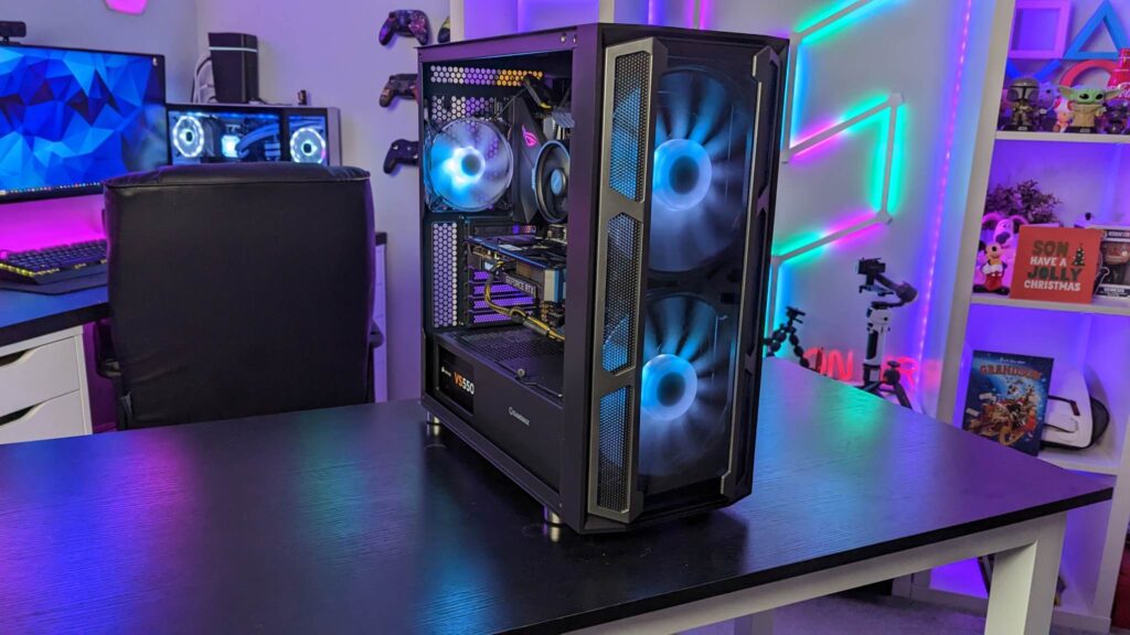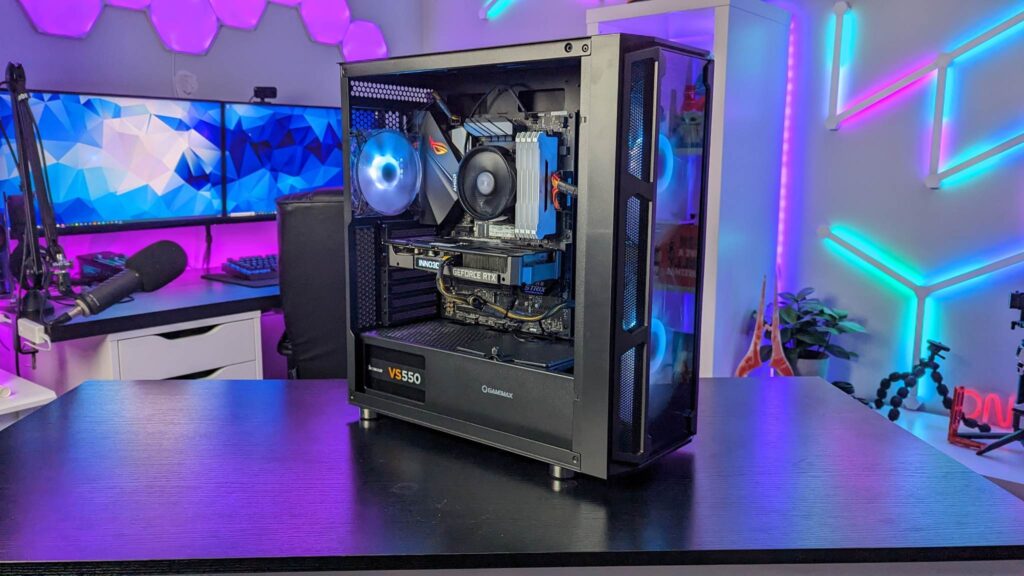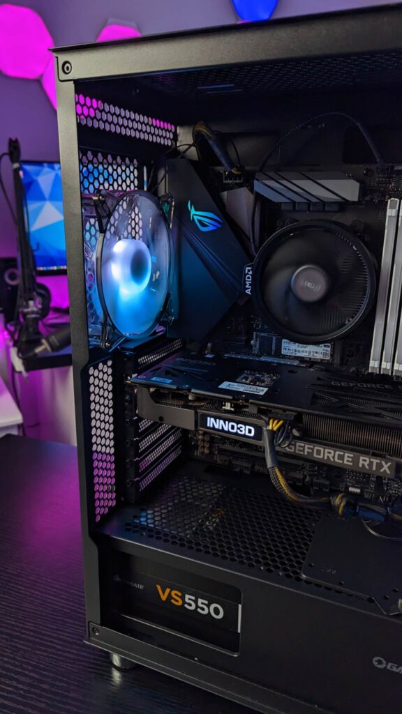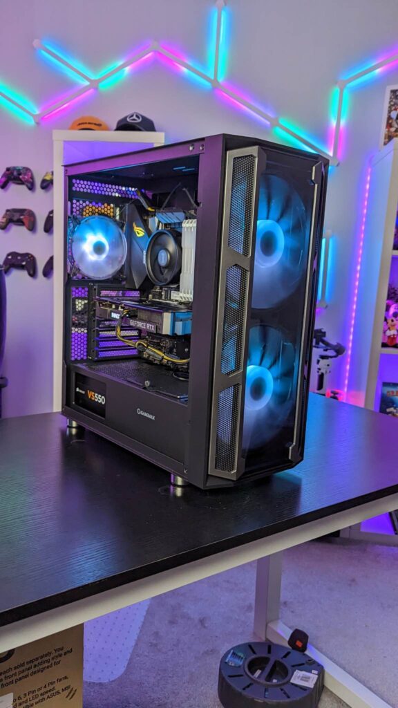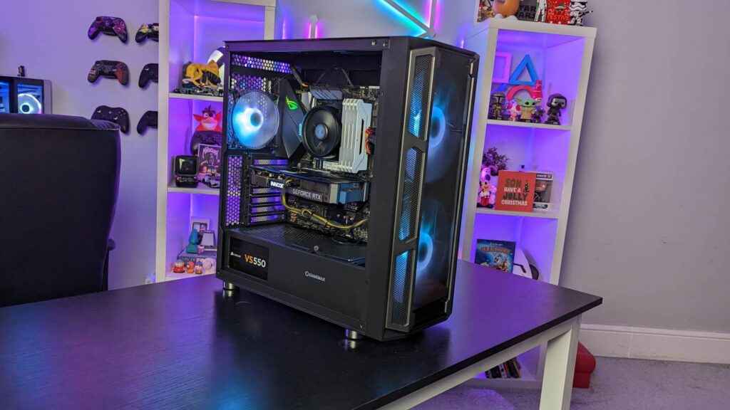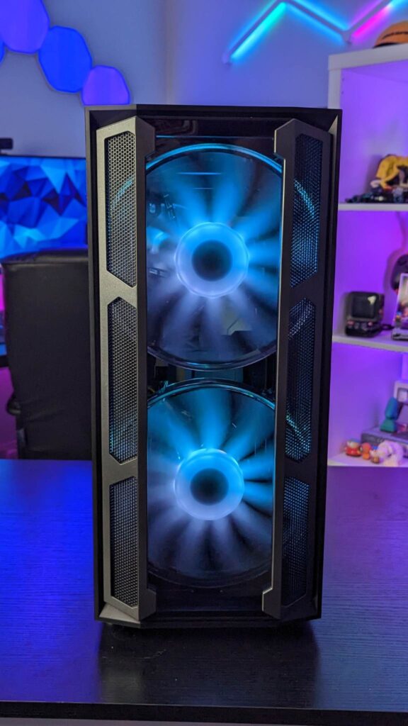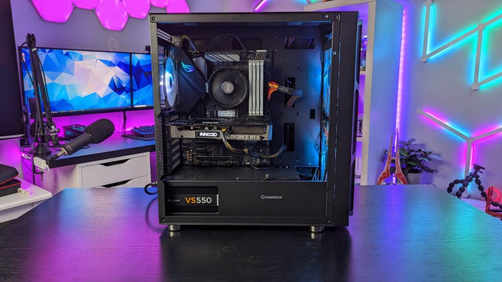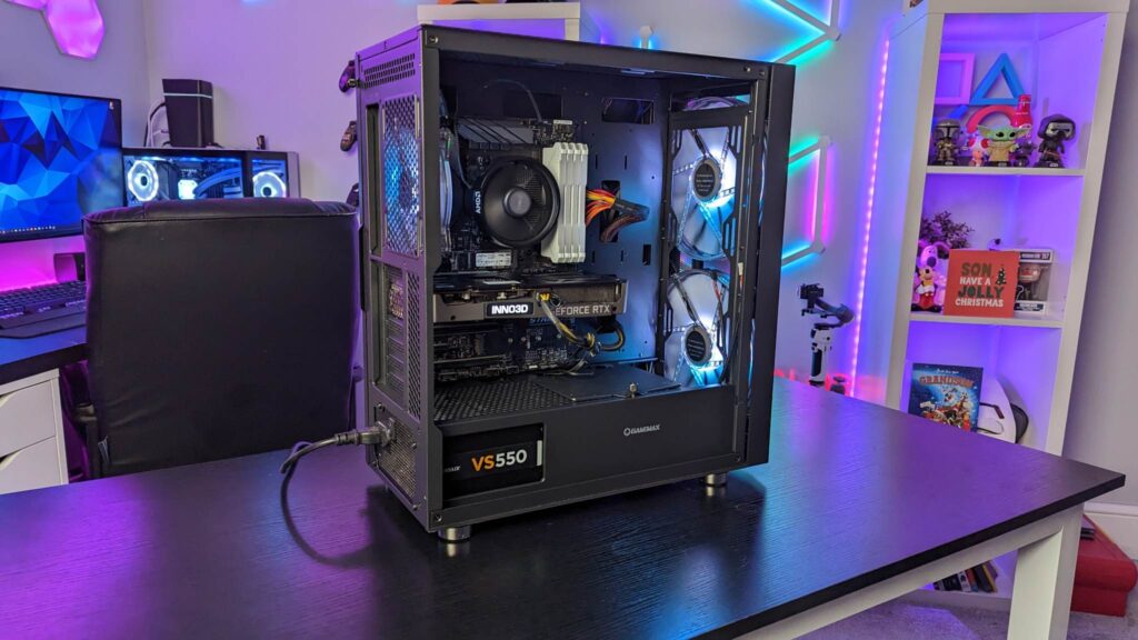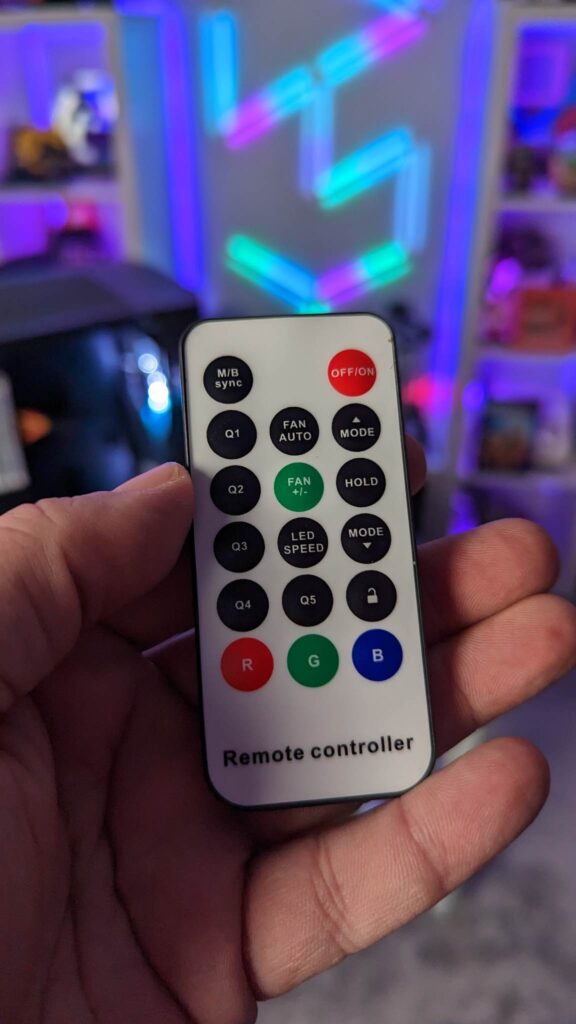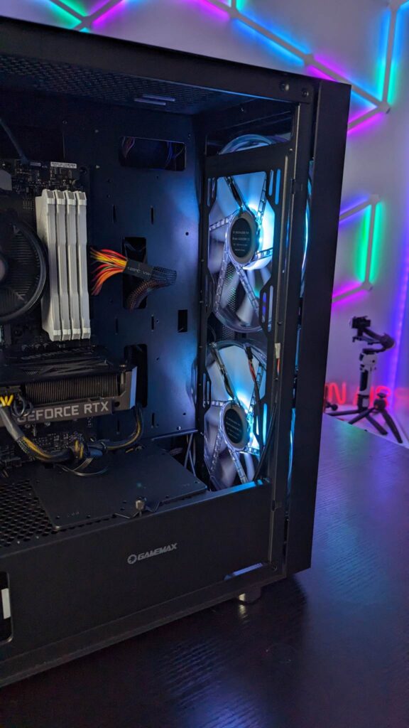 Grab yourself a GPU riser cable and you can mount it vertically right out of the box. Gamemax has given you 29mm for the cable management from all those fans and the standard ATX-sized power supply. And of course, you will need every single scrap of space if you end up with nine storage drives. Also inside is an easy-to-use fan hub, already wired and you get that aforementioned remote for the fans’ speeds, modes, and colours. It is also fitted with a three-pin AURA connector and VDG connector.