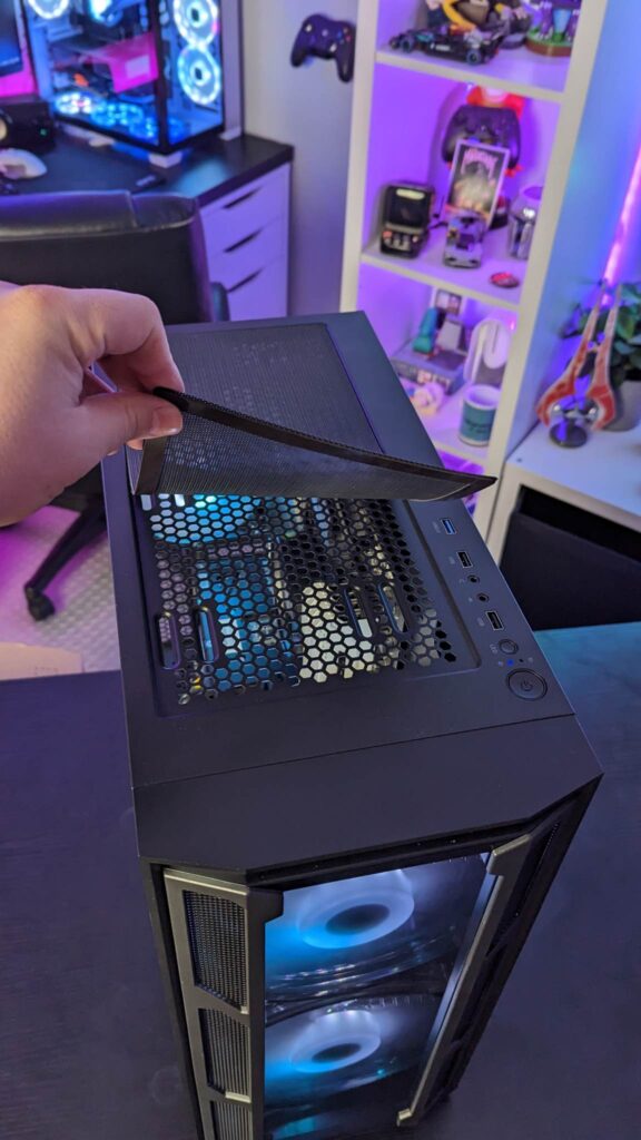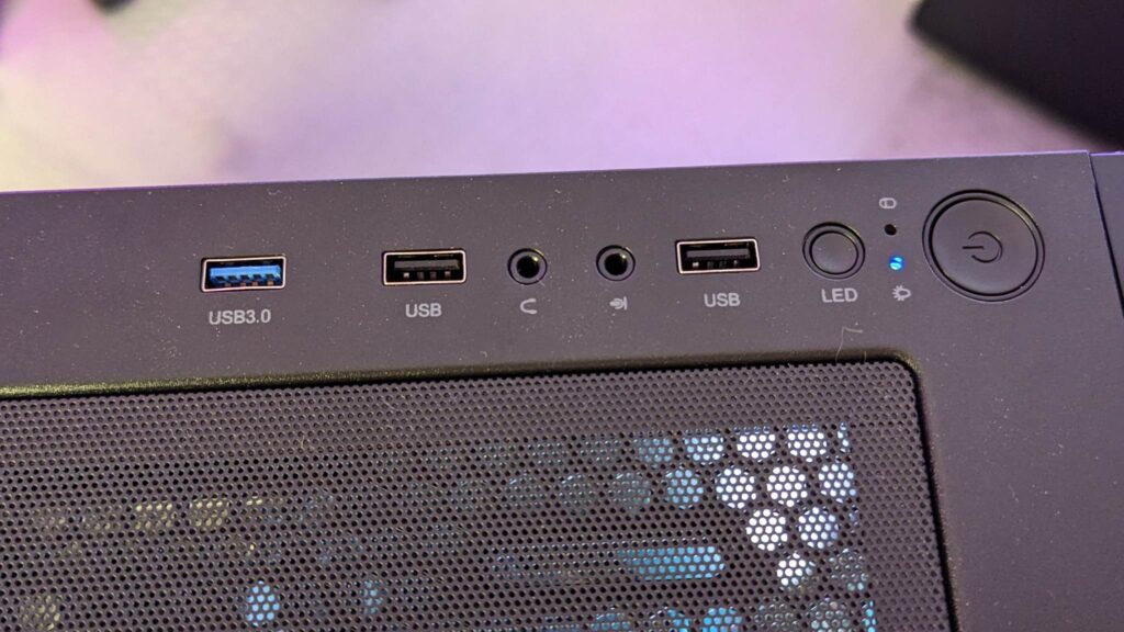 The reset button is wired into the hub so you can change the lighting mode by cycling through them all with the push of a button. On the front, there are the usual suspects of the power button, two USB2 and one USB3 slots along with HD audio and LED indicator. So, back to those fans and cooling in general. At the front, it comes with two 200mm ARGB fans but you could swap them for two 140s or three 120s and at the rear, there is one 120mm ARGB fan. There is room for two LED strips as well if that’s your thing. But of course, there is space up top for a wide range of radiators – at the front, there is room for up to a 360mm, on the top a 240, a 120 at the rear, and two 120mm fans on the bottom. Should be enough for anyone.