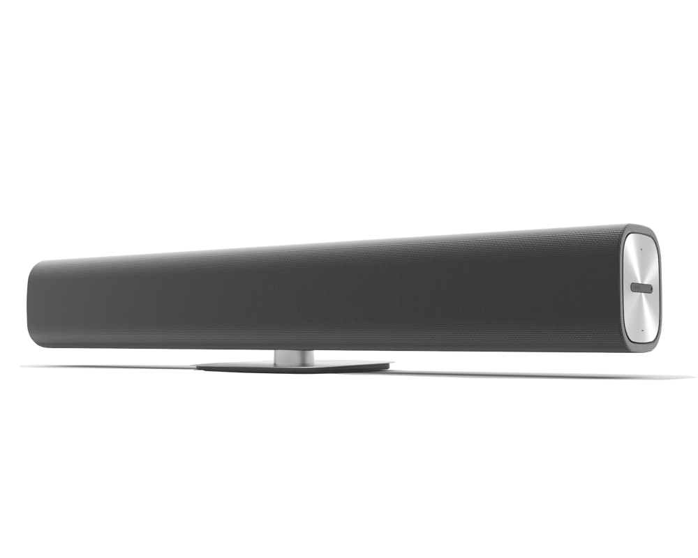 The Goodmans Aspect soundbar for the most part is covered in a soft dark grey material with a steel finish magnetic base. It looks pretty mean, and would suit a contemporary living room. There are two silver caps on each end, with one side making room for power, source and touch sensitive volume controls. There is a small included remote so don’t worry about having to turn it on and off on the unit every time.