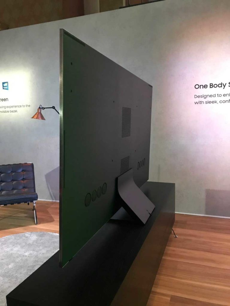 What else? The specs ofcourse! It’s an 8K QLED TV. It comes in various different sizes, it’s just 15mm deep which is crazy, it can sit completly flat against your wall and the bezel, it’s basically non existant, it’s truly beautiful. The TV offers a 5.1 vitrual surround sound solution, thanks to an array of speakers to the rear of it and if you connect to the TV up with a compatible soundbar and the audio will not only come out of the soundbar, but the TV too, helping improve the overal audio quality. They’re calling this Q sympathy.
