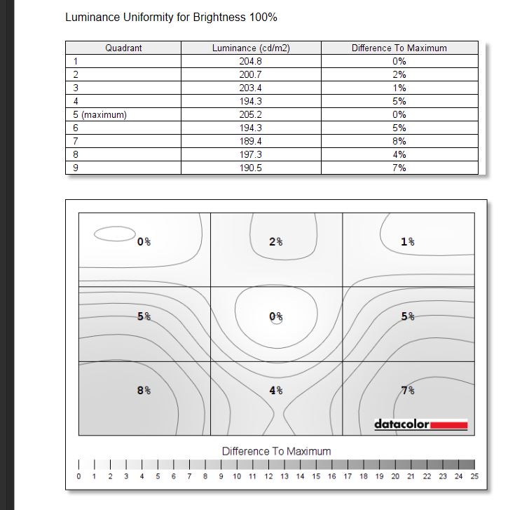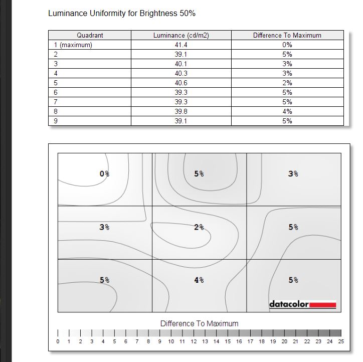 Where it did fall down though is with colour uniformity, where you can see at 100% brightness, dark spots appeared in the lower corners, and a hot spot at the top in the middle, but lowering the overall screen brightness did help with this, but it still tracked. However, saying all of this, in reality, I never noticed or had any complaints with it while gaming or watching media, so while these measurements are what my Datacolor SpyderX produced, it didn’t affect my day to day use of this monitor I was still very impressed with its performance. If you want more information, check out the gallery below.