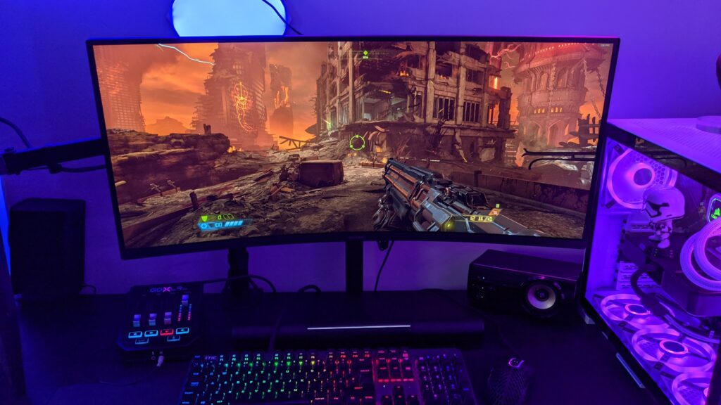 In terms of performance though in real life? I absolutely loved it. I am finding myself enjoying ultrawide monitors more and more these days, and the added immersion I get from games, especially those compatible with the ultrawide resolutions is superb. My favourite so far has got to be F1 2021 and its cockpit view. It felt great bombing it around Portimao. I also tried some Star Wars Battlefront 2 and some Rocket League and even Raft believe it or not over on the TechNuovo Twitch channel, and even that felt super immersive. I also didn’t notice any screen tearing either throughout my time testing and the colours after I ran it through a calibration using my Datacolor SpyderX, everything looked fantastic. I must admit though, these sized monitors aren’t really for the competitive gamer out there, purely because not all of the screen is in direct eyesight at once, though a game of Warzone, or Valorant is still hugely possible and very enjoyable.