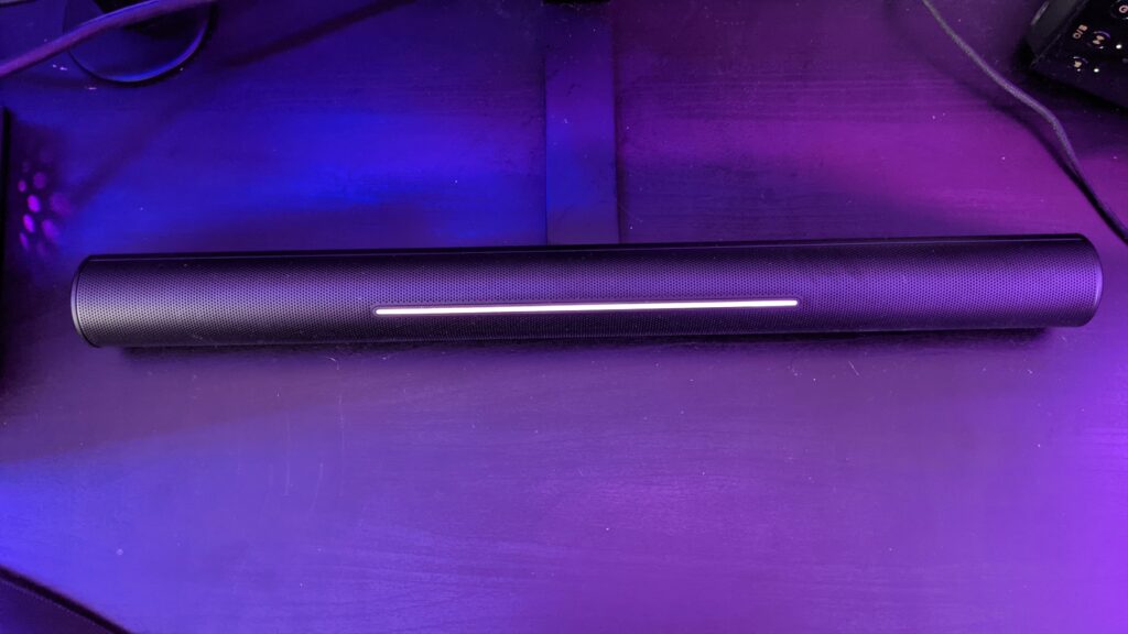 What’s the major standout feature though of this particular monitor is the built-in speaker attached to the base of the stand. Rather than the standard base found on the MateView, it’s been replaced with a cylindrical speaker. And for a speaker built into a stand, and acts really like a small desk soundbar. It’s not going to blow you away with big boomy audio, but if you’re wanting to watch a few YouTube videos, or Netflix while you’re working, it produces some clear audio for voices. It’s far better than probably every single other monitor with built-in speakers, so they’ve done a great job here. It lights up in a number of different colours and patterns depending on your style and colour scheme which is a nice touch. And speaking of touch, you can raise and lower the volume by sliding your fingers on the light, or tapping to mute. The only nit-pick though is you can’t tuck your keyboard underneath your monitor, as the speaker is pretty thick.
