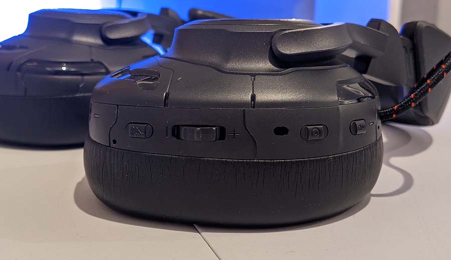 Down the left earcup you can find your interface, and for the most part, it’s very simple to use. So from top to bottom, you’ve got the ANC / Talkthrough button which switches between having full active noise cancelling audio and the abilty to hear your surroundings. You’ve got the re-centering button for head tracking, which we’ll go into in a moment. Next up is the volume wheel, and directly underneath that is the microphone mute button which only activates when you have your microphone plugged into the headset. And around the bottom of the left earcup are your inputs for the 3.5mm aux jack, your microphone input and the USB Type-C input for your audio controller, and your USB input for your PC.