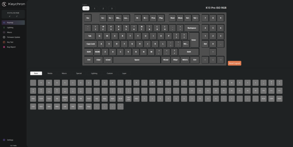 First off, the K13 is extremely Mac-focused with its Command and Option keys. Whether I’ve just been sent this variant I am not too sure, but as a Windows user, I’ve done a bit of a sick in my mouth. I can’t see an option on their website for a Windows-style layout, but alas this isn’t the end of the world. My version here has the RGB backlight which isn’t very bright really, and I’ve got low-profile Gateron brown switches, which for the most part are pretty satisfying to type on, and in no way loud or clicky or tactile. They’re nice and muted though I’m not quite sure if you’re a mechanical switch enthusiast that you’d really like the sound profile here. And being super low profile, modding is really non-existent here. What you see and feel is what you get really.` They are hot-swappable though if you’re someone who favours a specific type of switch, though at this point I’m not sure spending £100 here on this keyboard if you’re going to be swapping out the switches is the best way to go really.