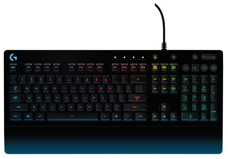 So if we take a wider look at the Logitech G213, it’s huge, although quite minimalistic. It features a full QWERTY style keyboard as well as a numberpad down the right hand side which is found on most keyboards anyway. The depth on your desk is where this is going to make a difference. They include a soft touch palm rest to aid your wrists and lower the chances of developing things like repetitive strain injuries.