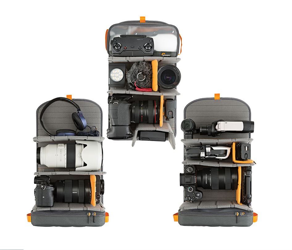 So what do we get with the Lowepro Freeline BP350AW backpack? Well, quite a bit of space actually. The whole backpack works off a three tier shelving system, with a top and two side zips for easy access. The bottom of these shelves houses a smaller bag with three compartments. Perfect for smaller accessories. The inclusion of two soft orange dividers makes it easier to protect your gear from colliding with eachother when you’re in transit. If it’s easier, you can snap the front and rear of the shelving unit to remove it completely from the bag to install your gear. However, you cannot install the dividers and then snap it down to put it back in the bag.