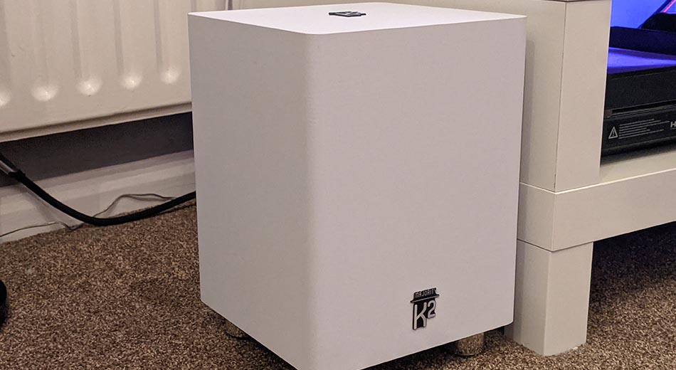 It comes in two colours being white and black, and we received the white one to review and I must say it does look quite good. If you’re looking at the subwoofer, you’ll see K2 branding on both the front and top of the device. On the front is a grill that covers the entire face, while a gloss plastic finish wraps around the entire body. Around back are two mounting holes so you can hook it to the wall underneath your TV, which will look great if you’ve got white walls. And with the subwoofer being wireless, the only cable you’ll have to worry about hiding is for power.