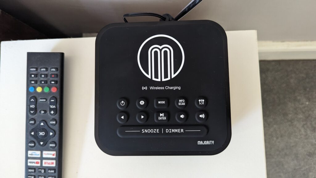 The Majority Knapton is a small box with rounded corners that measures at 14x14x7 centimeters so it’s nice and small to fit onto a bedside unit, which is where mine is living right now. It’s got a wireless charger on top for your phone which is a great feature in my opinion as it saves having an extra lead from your phone charger running to your bedside table too. The Knapton does require power either with a three-pin UK plug or a small disk battery.