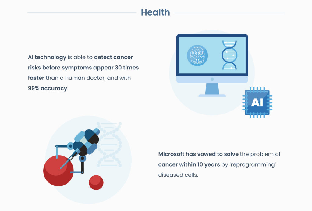 Nanotechnology is already playing a huge role in surgery, particularly in oral procedures where miniscule nanobots have been developed to reduce pain and recovery time. Futuristic technologies are also playing their part in diagnosis, surpassing what even the most skilled physicians can do in some cases. One AI system can predict heart attacks and strokes more accurately than its human counterpart. Another AI technology is able to detect cancer risks before symptoms appear 30 times faster than a human doctor, and with 99% accuracy.