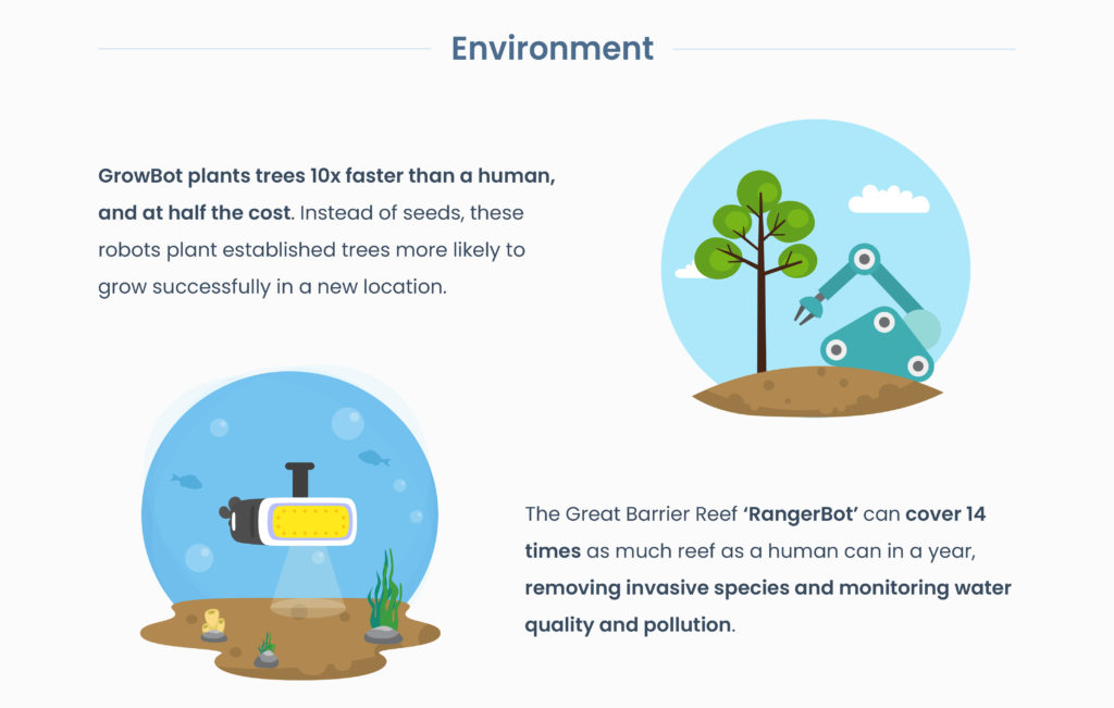 For example, Australia is home to the GrowBot which plants trees 10 times faster than a human, and at half the cost. Instead of seeds, these robots plant established trees more likely to grow successfully in a new location. The GrowBot team hopes to deploy over 4,500 of these machines to help revitalise the world’s forests.