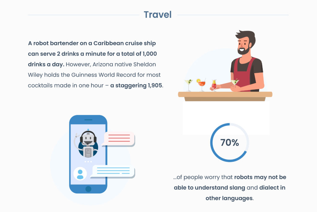 There are question marks around how robots measure up to humans in other ways too. In a study by Travelzoo, 70% of respondents felt that customer service robots struggle to understand informal language, local dialects, irony, or sarcasm, which may add fuel to fire for travellers already experiencing a frustrating holiday. These sentiments are echoed in a study from SITA Lab which shows that, although humans prefer using automated services for simple steps like check-ins or bag drops, we’d much rather speak to humans to deal with problems relating to our journey or documentation. So, although robots can make travelling easier in certain ways, humans still have the edge for now.