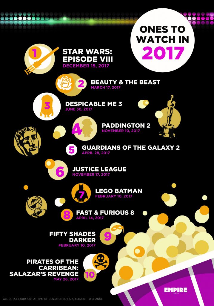 With 2016 bringing us some wonderful films such as Star Wars: Rogue One, cocky hero Deadpool and Zootopia, which opened our eyes to class and race segregation, it’s a wonder if 2017 is going to beat it. Well, Empire Cinemas has put together a handy infographic to show us the most anticipated films of 2017.