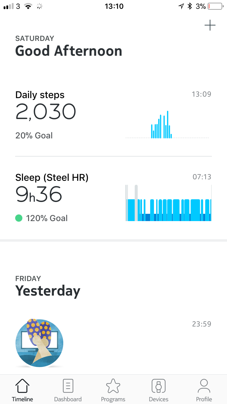 I wore the watch for a few days, all day, every day and found it very interesting. It would monitor my daily amount of steps, which I could check throughout the day & set my own targets. I could also monitor the miles walked, average heart rate and calories burnt, both via the watch and within the app. When I went to sleep, it would monitor how well my sleep was, whether I hit my 8hr default target and how my sleep was. It would tell me when I fell asleep, when & if I woke up during the night and also if I was in a light or deep sleep. All very interesting stuff! I took it for a swim, as the watch is fully waterproof, held down the button to tell the watch I was about to do an activity and the results got stored onto the watch. The watch & smart device do need to be close to each other for the app to update! Overall, some cracking features.