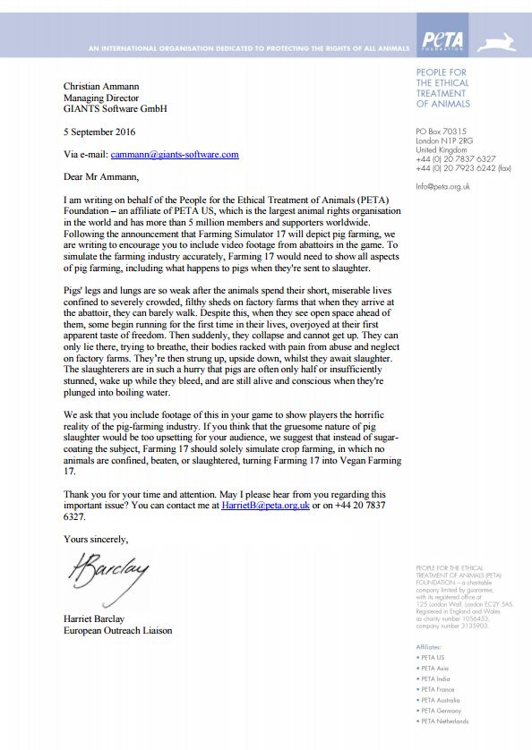 “Farming Simulator 17 should either show the nightmarish reality endured by pigs at the abattoir or change into Vegan Farming Simulator 17 and let players grow crops – to do anything else would be dishonest”, says PETA European Outreach Liaison Harriet Barclay. “PETA urges anyone who considers pig-slaughter footage too gruesome to include in a simulator game to rid their real-life plates of animal corpses and switch to cruelty-free vegan foods.”