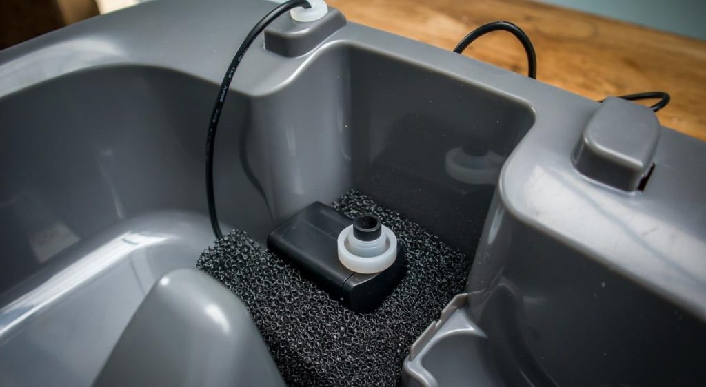 The fountain comes with two levels of filtration, the first being the wire wool-like foam, which will catch any large pieces of debris, such as hairs, food etc. After that initial filter and further along the line, there is a carbon filter which is placed within the pipework, to help remove contaminants and impurities in the water. You can clean the foam filter and buy replacements for both relatively cheap online. The fountain works via a small pump located at the bottom of the tower. Water gets sucked into the pump from the bottom of the fountain and then release at high level at the top of the tower. The pump is mains powered, so the fountain needs to be within one meter of a socket (unless you use an extension lead). How much water released can be adjusted very easily by turning the nozzle underneath the cover at the top.