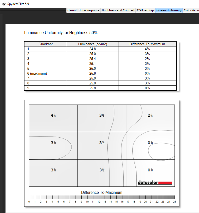 For its brightness and contrast, the EVNIA achieved a contrast ratio of 8,720:1 at 100% brightness. However, knock this brightness down to 75% and we saw a contrast ratio of 13,540:1 which was astounding. The white point sat at 6,400 which again was great to see and colour uniformity was super balanced across the entire panel at 50% brightness, with I suppose its dark spot hitting in the bottom right corner at 0.6 but oh no, what a shame that is. Look, there’s literally nothing wrong with this score at all and even at 100% brightness, there was still nothing really to comment on except maybe an outlier in the bottom middle, but nothing again shocking at all. Luminance uniformity was pretty much dead on again, with I suppose a bit of imbalance on the left-hand side of the panel at a 50% brightness, but again these numbers thrown back are nothing to be concerned about. Did we just win the panel lottery? Of course, this could be just this panel proving great, but it’s what I’ve got to comment on, and saying this, I mean my sentiment still stands. Wow.