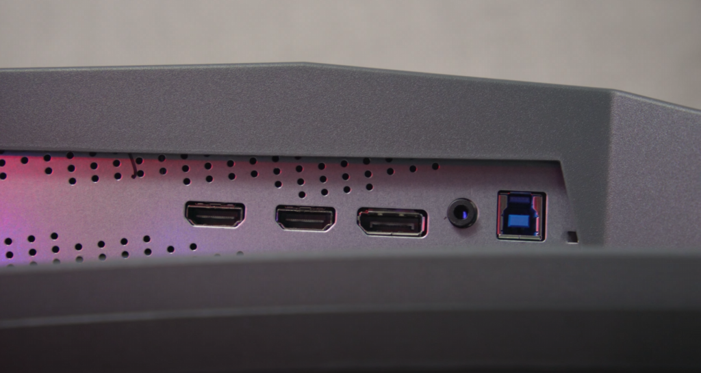 Underneath you can find several inputs including a DisplayPort 1.4 and two HDMI 2.0 ports. You’ve got a headphone out, a USB 3.2 hub with a USB upstream and two USB downstream. One also has fast charge capabilities for phones and laptops and other devices. No video through USB from laptops though.
