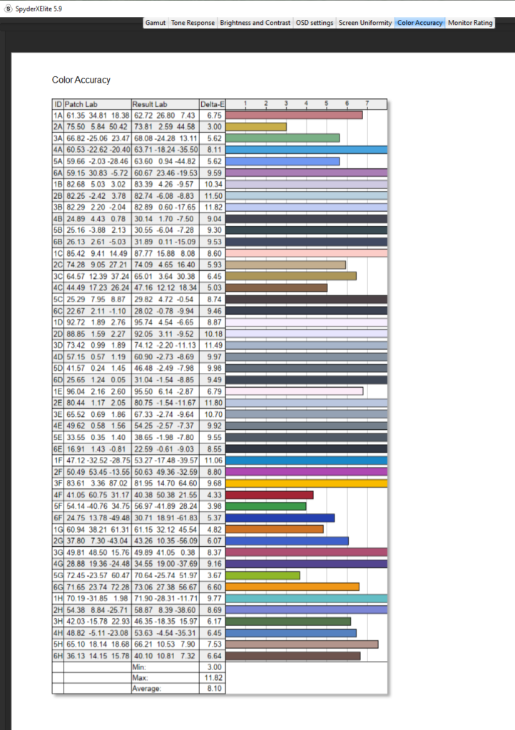 Now this is where things got a little bit strange for me because colour accuracy according to my Datacolor Spyder Elite was off. And this is where I cheated a bit and checked out other reviews on YouTube because I saw people were getting Delta-E averages of around 1.4. My Delta-E average, the best I could get was around 6.8. Okay, so let me explain bare with me a bit here. My first test I ran pre-calibration in Standard Picture Mode with sRGB off, gave me a Delta-E average of 7.26. My second test, I ran post-calibration again with sRGB off gave me an average of 6.23, so getting better. However, my third test, with sRGB on, my white balance at 6500k, and at 50% brightness this time, gave me an average score of 8.10. So who knows if I’ve been super unlucky with the panel lottery here? My fourth test because I thought at this point what the hell, was run in the Game 1 image mode, gave me a colour accuracy of 11.43. Go figure. I used my Datacolor Spyder on my MSI panels here, and no problems, so I know I haven’t got broken equipment. I just don’t know why these Philips Evnia monitors, which have been the second I’ve tested now, give me such an issue with measuring colour.