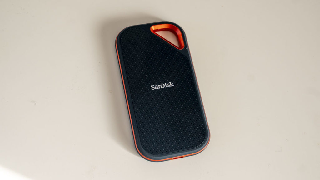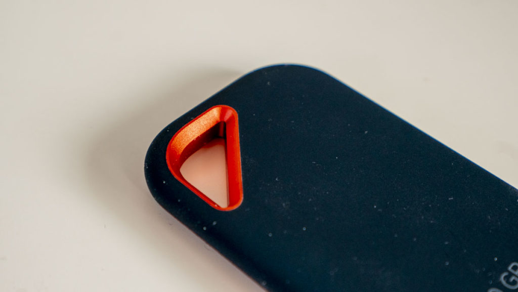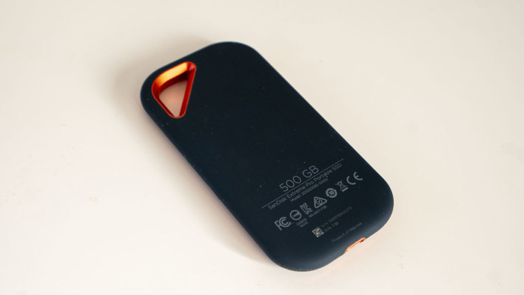 But, any case, this is a me problem, and not a you problem. So let’s get on with the review. The SanDisk Extreme Pro SSD drive is very small compared to the more traditional external HDD drives. The rear is covered in a soft to touch, almost rubbery like finish while the front has a plastic, carbon-fibre like design. The top right as a hook for a keyring so you can keep it on you. The whole thing is around the size of a stack of bank cards, so is pretty small to keep in a bag or even your pocket.