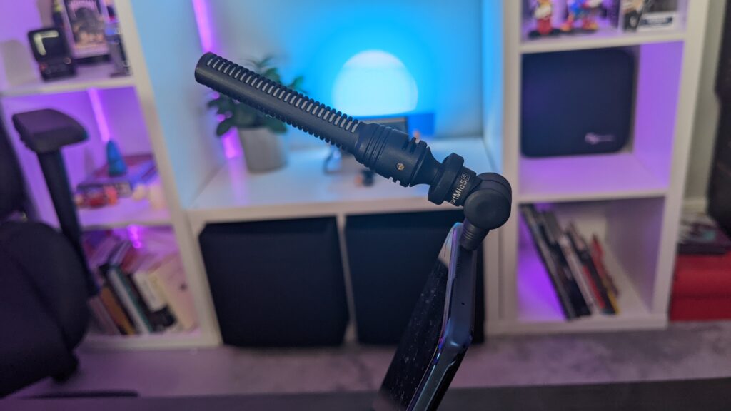 I first tried the SmartMic5 S with my mobile phone, and immediately run into an issue. Not because of the microphone, but due to Google thinking it be a good idea to use 3.5mm aux dongles on their Pixel 4 series to attach accessories to. This is quite annoying, as of course my 3.5mm to USB Type-C adapter is floppy, so when I plugged in the SmartMic 5, it pointed straight down. And even when I bent the stem towards my mouth area like you would a normal shotgun microphone, the counterweight just made the microphone continue pointing down, so this was a fail. If your mobile phone has a headphone port, then it would be completely fine as the microphone could sit rigid. Thanks, Google, was looking forward to using this with my phone!