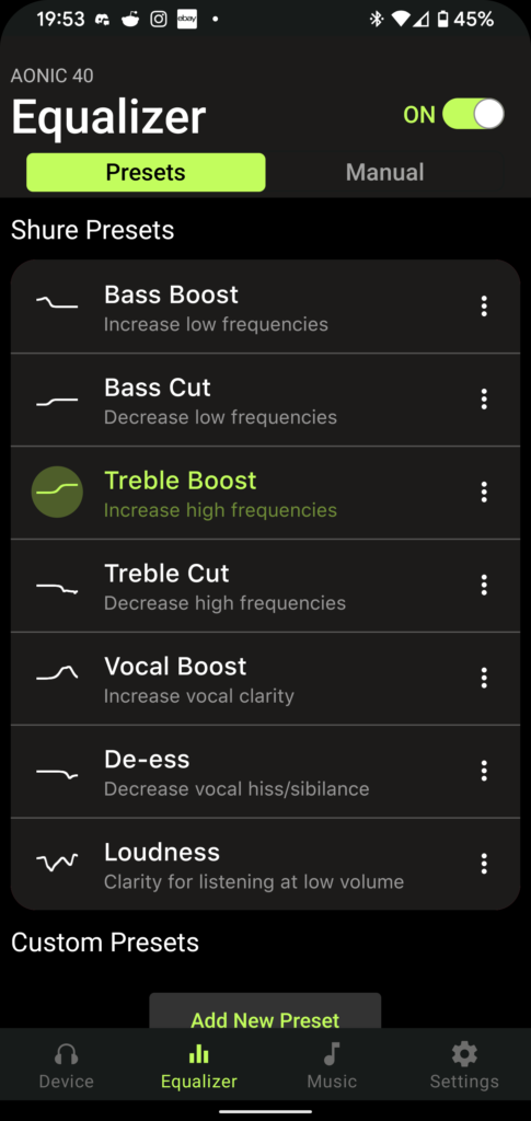 The standout feature on ShurePlay though is definitely the EQ, where you can set your audio quality using presets like a bass-cut, treble-cut, a boost to the vocals and so on, but you’ve also got a really in-depth custom EQ you can switch on that allows you adjust your gain, bandwidth, and frequency. To be perfectly honest with you, I don’t know what all of those do, and it took me a bit of experimenting to really find a sound I was pleased with, but the layout and how easy the app looks and performs is amazing for people with the lack of knowledge to hone in on their preferences right from the word go. Once you’ve found a manual EQ setting you like, you can save it as a preset inside of the app to return to at a later time. So you can really mix and match it with the genre of music you’re listening to.