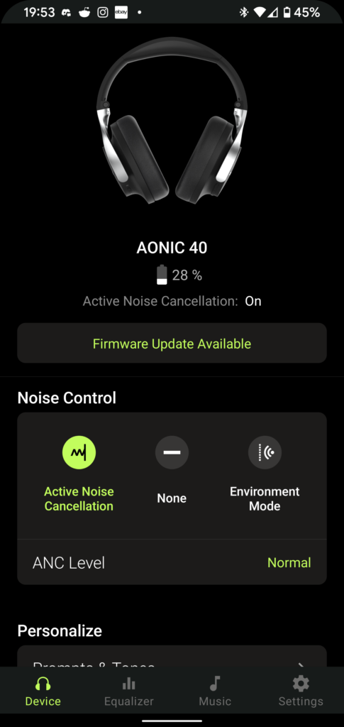 However, most of this stuff can be controlled inside of the partner app – ShurePlay. ShurePlay I must say is one of the best-implemented apps I’ve seen for a while for Bluetooth headphone offerings. There’s so much to this app that’s completely customisable that you can really dial your settings in. After all, this is what Shure is really going for with their studio accurate sound quality. The device page, as well as showing you your battery level of which you have around 24 hours and firmware updates, allows you to adjust the levels of the noise cancellation and environmental modes, aka ambient sound through a fader. For active noise cancelling I settled on low, as the medium and high setting introduced a faint hiss to my ears. It’s not off-putting by any means, but it can be noticeable during quieter audio. The environmental mode or ambient sound I kept whacked right up to the top in case someone needed to get my attention in the office.