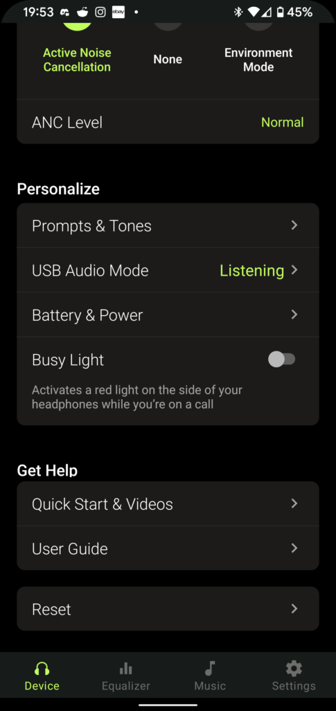 You’ve also got the chance to choose when the headphones signal you with a tone, like powering on and off or connecting with Bluetooth. I kept these as default, a USB audio mode for conferencing to lower the audio quality in favour of using the built-in microphone and a busy light, which is a small red light to indicate to others while you’re on a call, though this feature seems a bit dumb, as most people would associate a red flashing light as low battery and will probably interrupt you anyway.