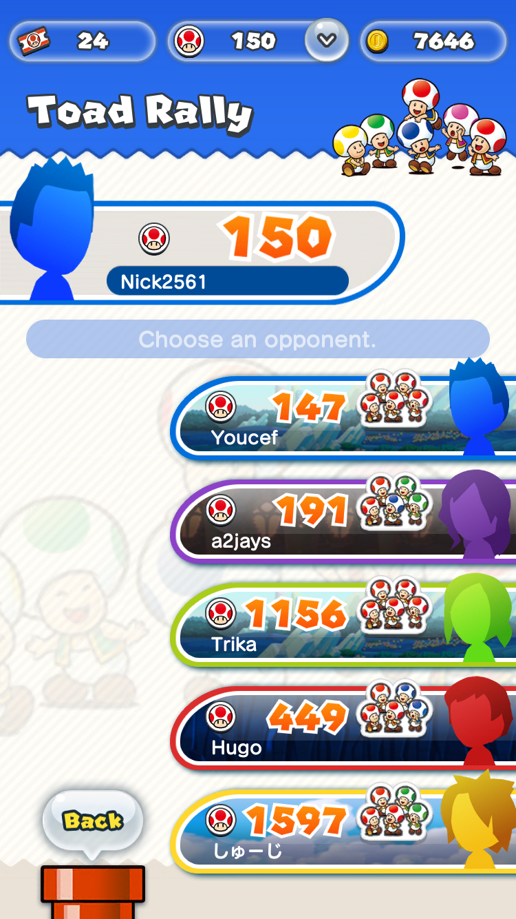 Rally is something new and see’s you going head to head with other players around the world, to compete for different coloured Toads! The aim of Rally, is to collect as many coins as you can, in the given time and hope you get more than your opponent. If you do, you will gain a number of different coloured Toads and they eventually unlock prizes. You can play against friends and compare your scores on a leaderboard.