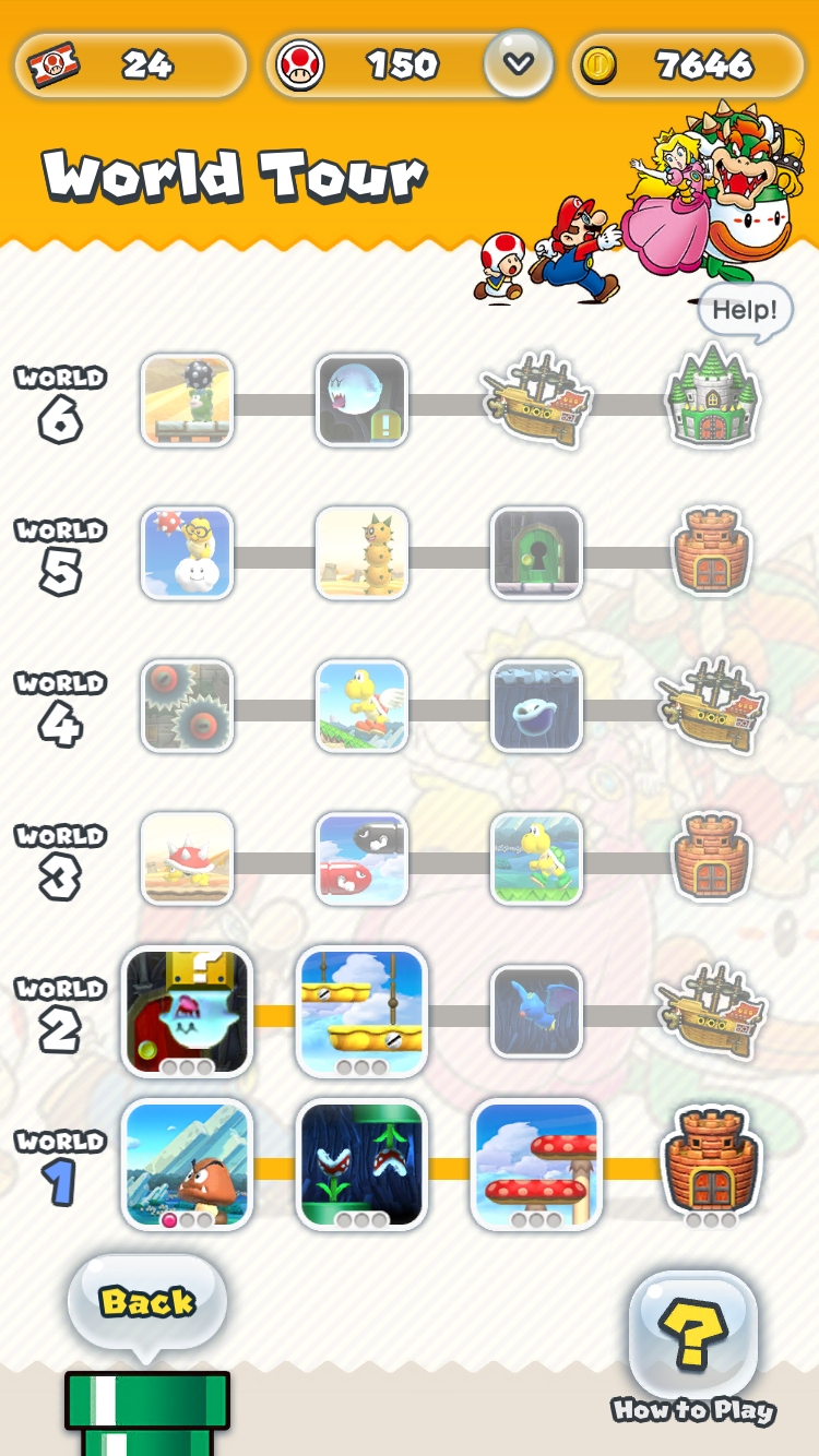 There are currently two game modes to play, Tour and Rally. Tour is the traditional game, offering six different worlds, with four levels in each, one of which being a ‘boss’ type level. Jump over gaps, jump on turtles, collect as many coins as possible in the allotted time and complete the level. There are also five special coins, varying in colour (not gold though) and are the more difficult coins to collect. This is a side mission of sorts, with the aim of collecting them all.