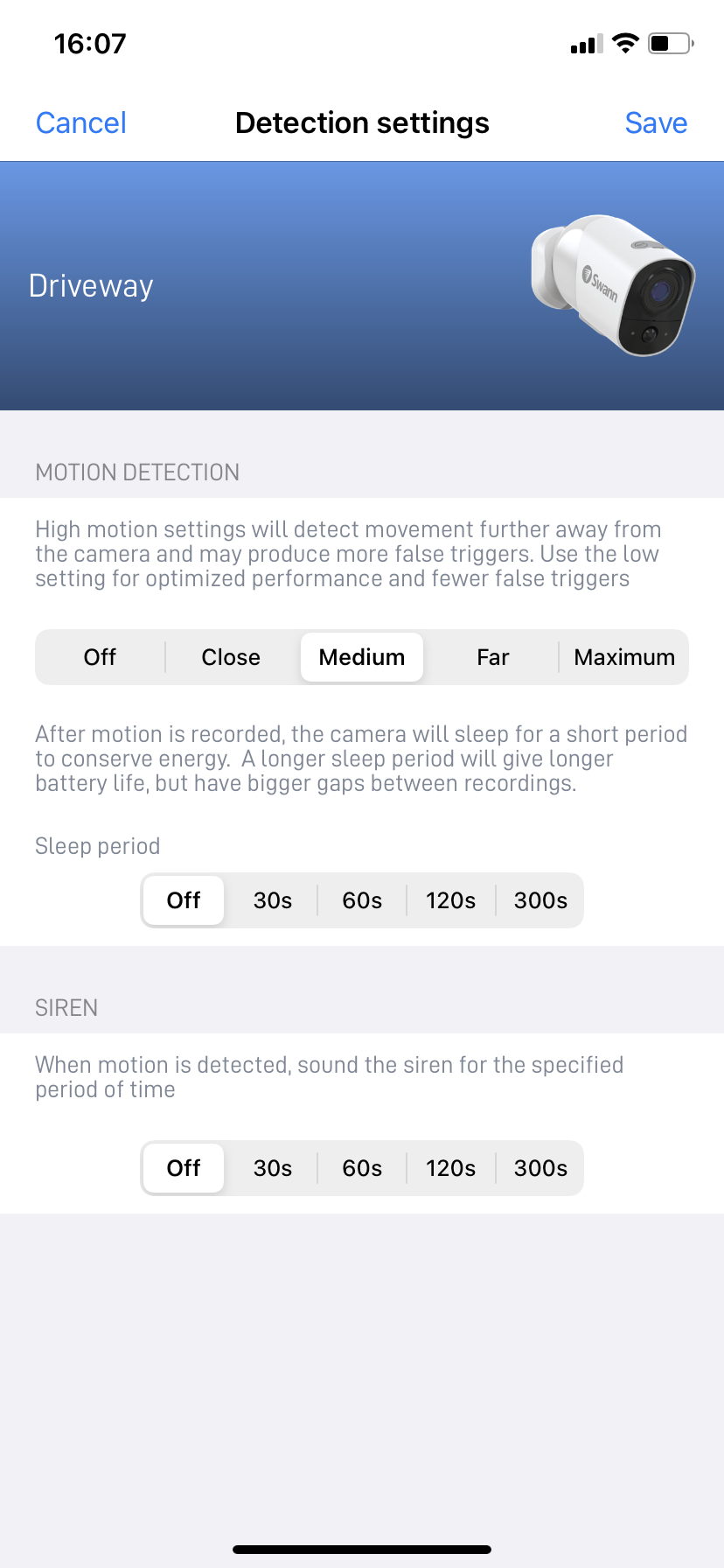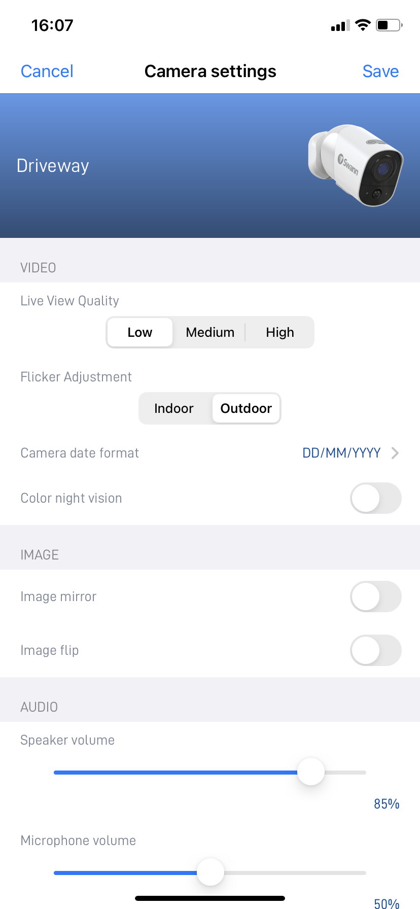 Within the app, there are a number of features and settings allowing you to get the most out of the camera. You can obviously live view the camera or go playback and view previous recordings. You can control each camera separately, if you have multiple, with each having different settings if you wanted. Go into a camera, you’ve got camera settings like live quality, colour night vision, image mirror or flip depending on how you’ve mounted it, plus speaker and mic volume. Detection settings, motion, set how sensitive you want the detection to work before recording. You can also set a sleep period and siren. Modes, if you’re at home, you can set the camera(s) to work a specific way to say your night mode or way mode. You may want a more sensitive detection when you’re away or maybe if you’ve got a camera somewhere that will always go off when you’re at home, you turn that one off under home mode.